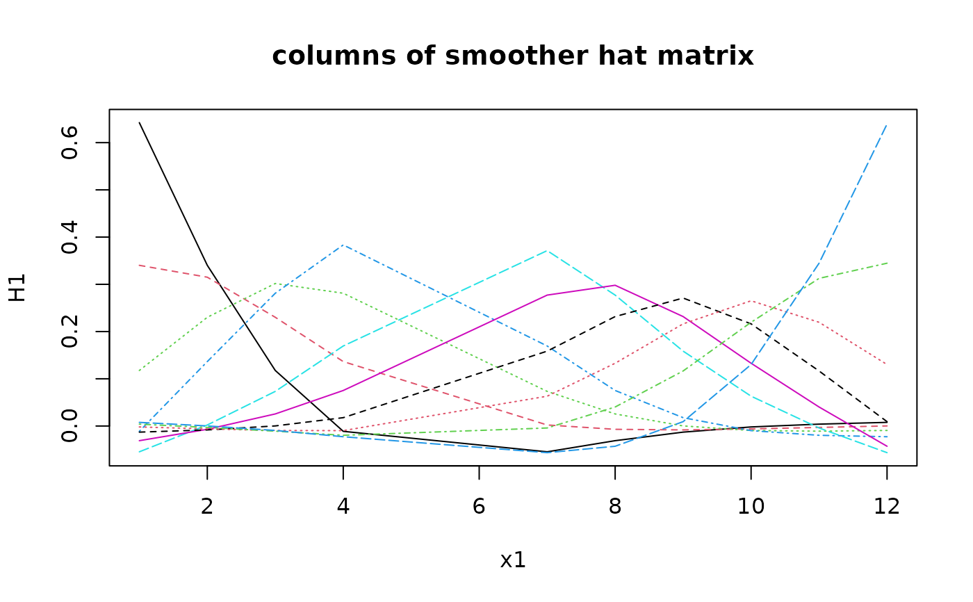 matplot(x1, H1, type = "l", main = "columns of smoother hat matrix")