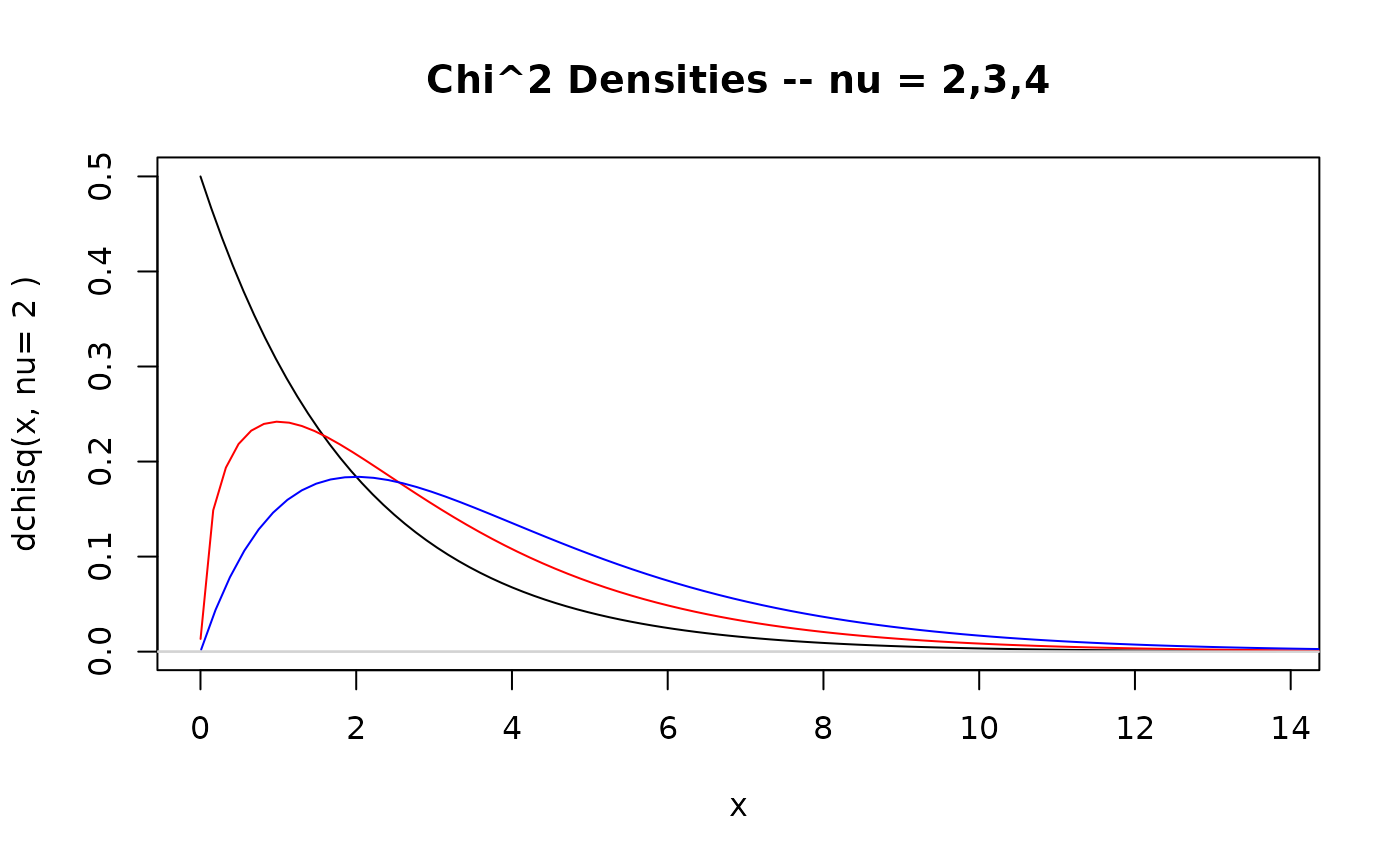 p.dchisq(2, main= "Chi^2 Densities -- nu = 2,3,4")