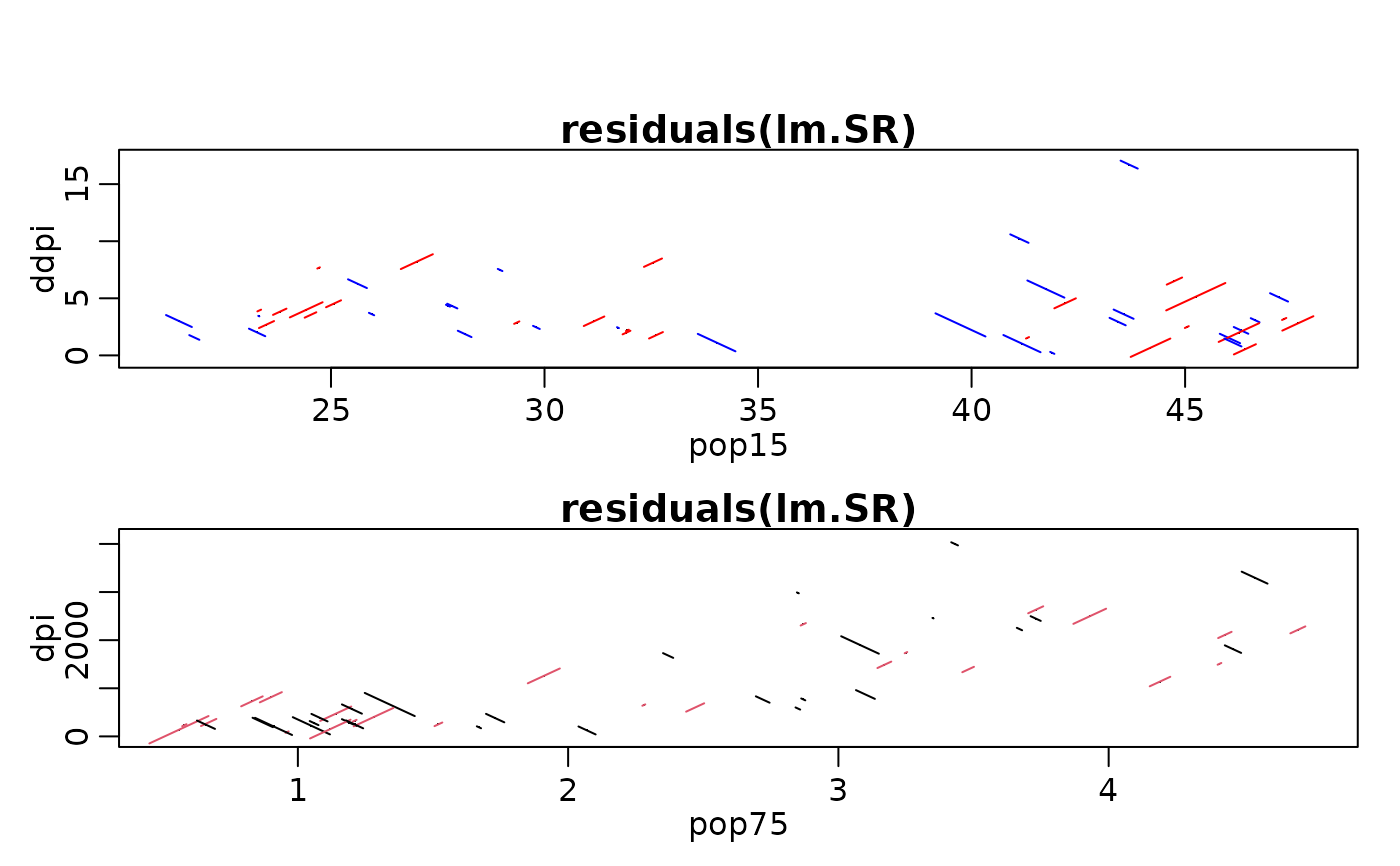 { p.res.2x(pop15, ddpi, residuals(lm.SR), scol=c("red", "blue"))