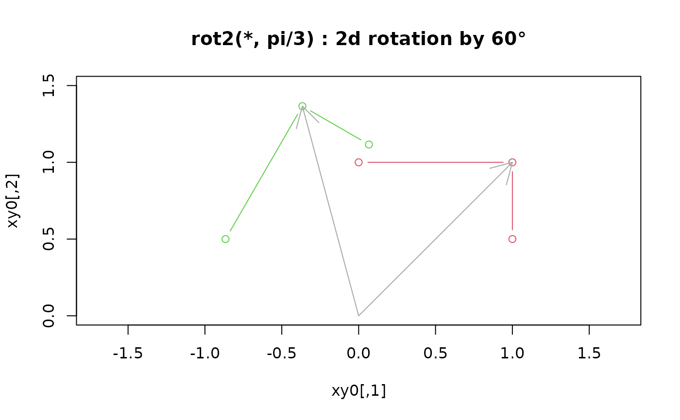 xlim=c(-1,1), ylim=c(0,1.5), main = "rot2(*, pi/3) : 2d rotation by 60°")