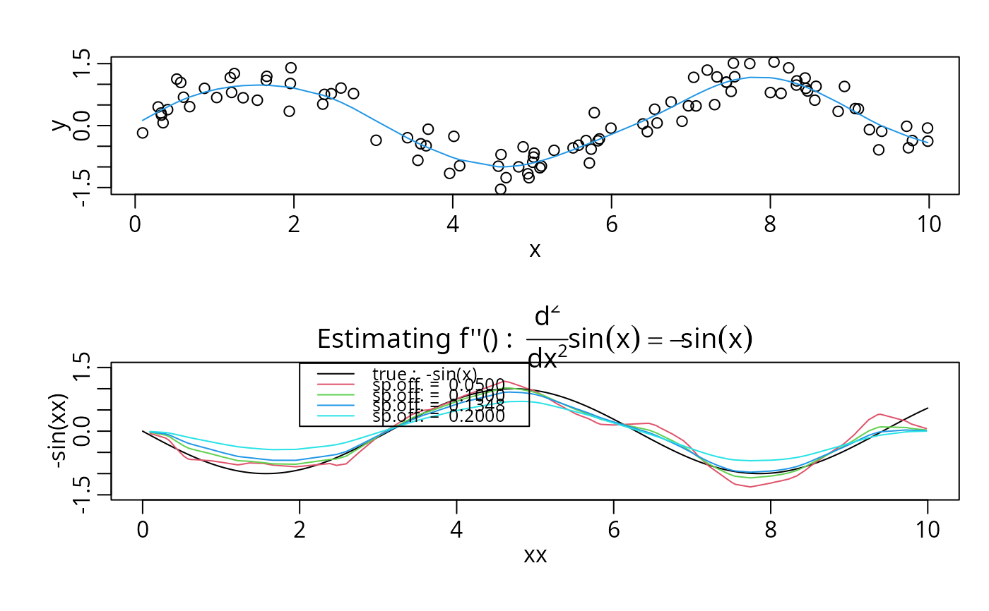 legend(2,1.6, c("true : -sin(x)",paste("sp.off. = ", format(offs))), lwd=1,