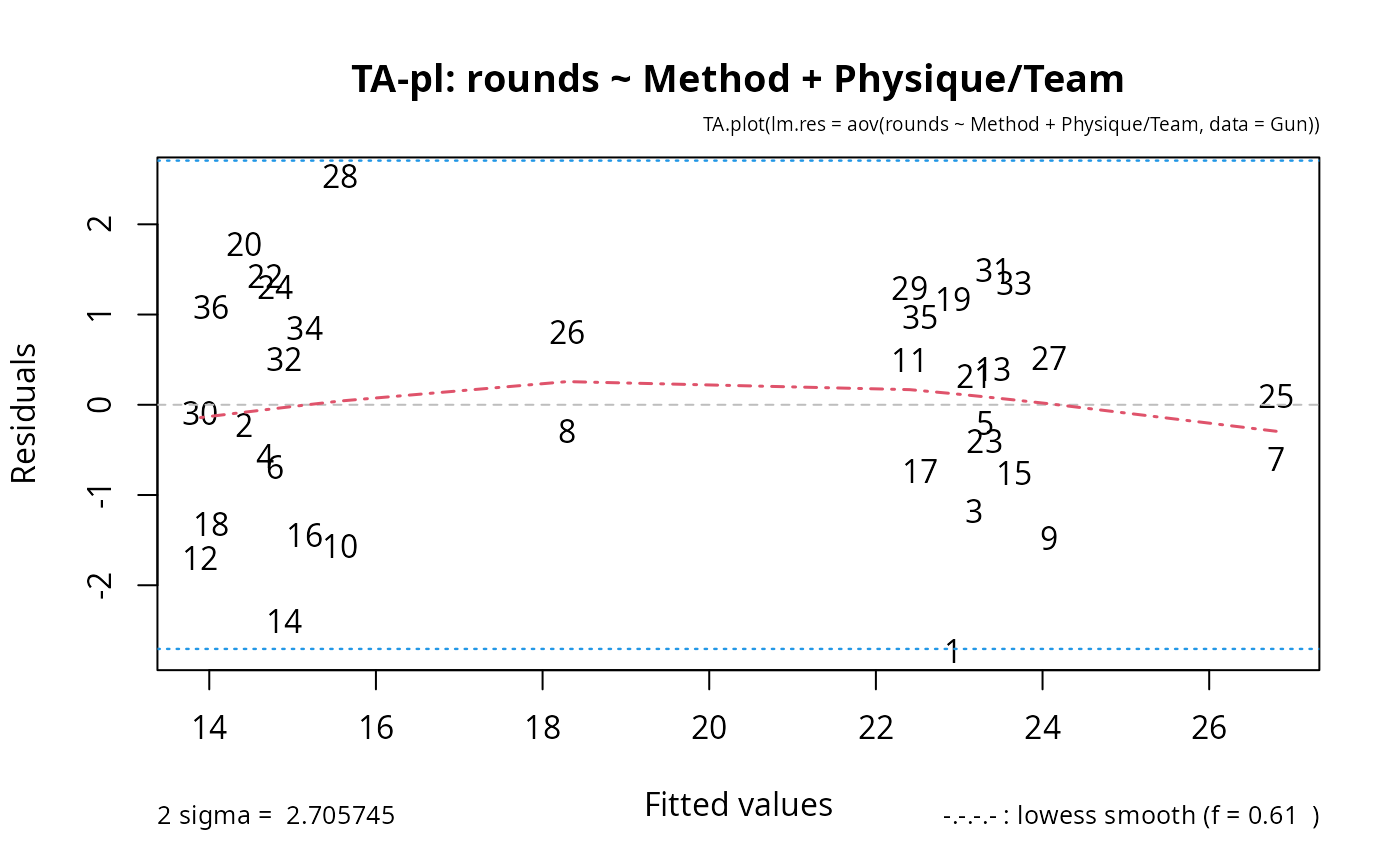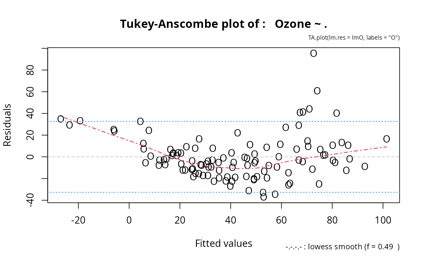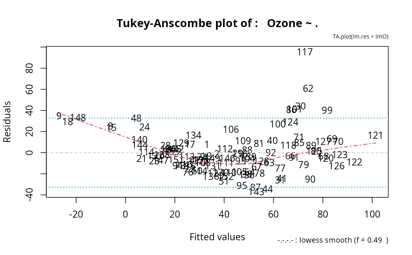 TA.plot.RdFrom a linear (or glm) model fitted, produce the so-called Tukey-Anscombe plot. Useful (optional) additions include: 0-line, lowess smooth, 2sigma lines, and automatic labeling of observations.