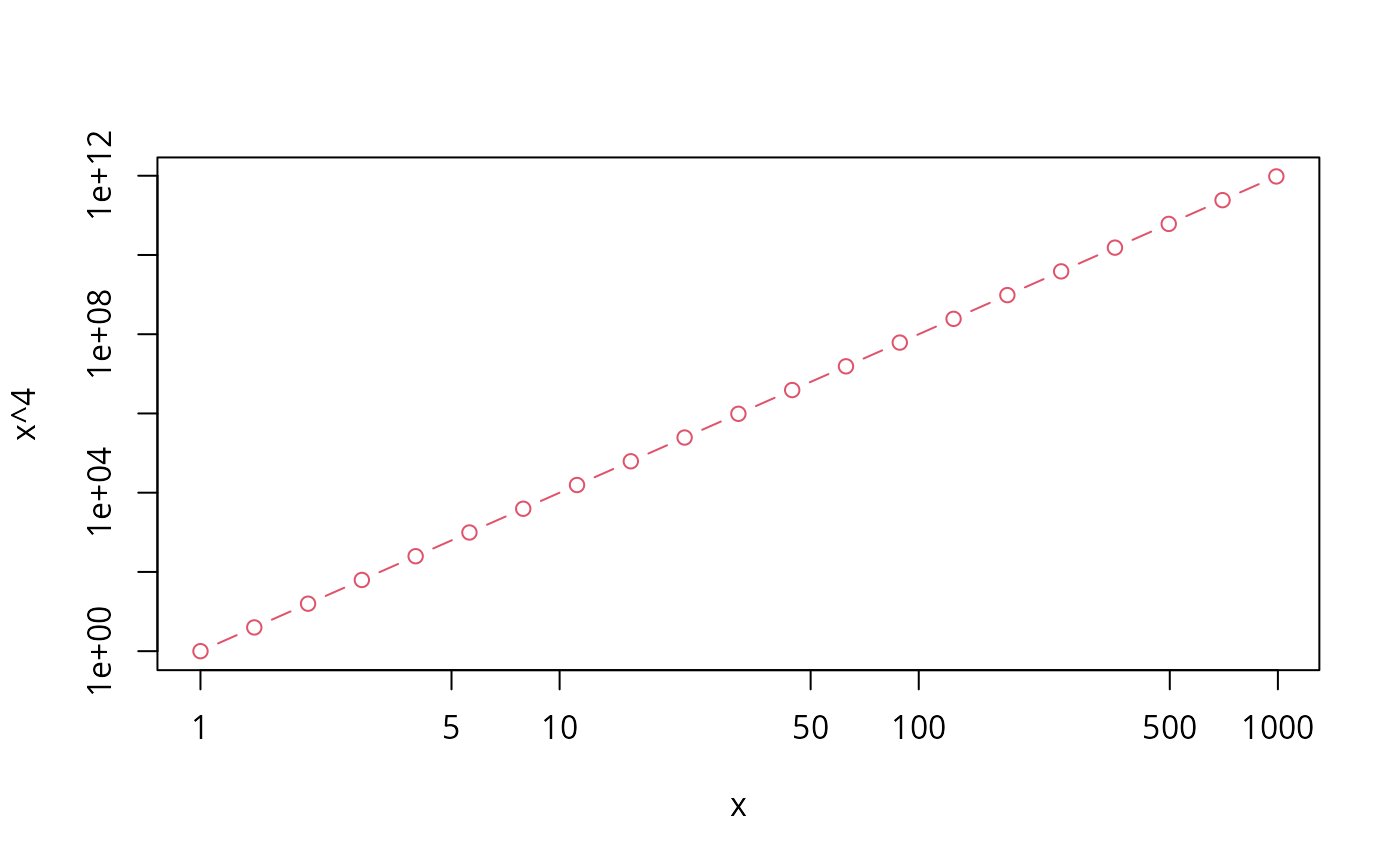 plot(x, x^4, type = "b", col = 2, log = "xy")