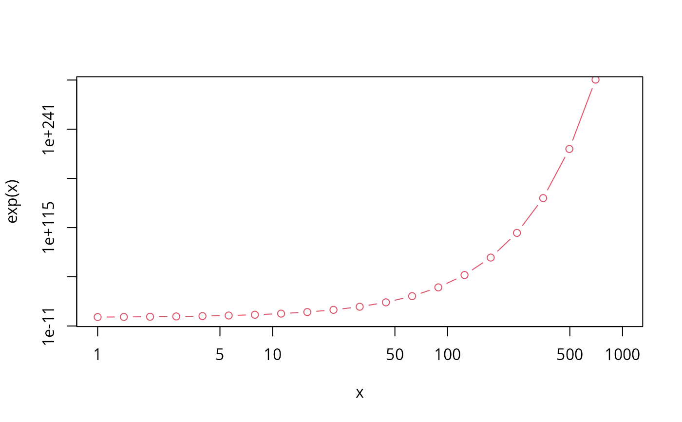 plot(x, exp(x), type = "b", col = 2, log = "xy")