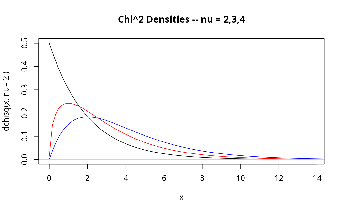 p.dchisq(2, main= "Chi^2 Densities -- nu = 2,3,4")