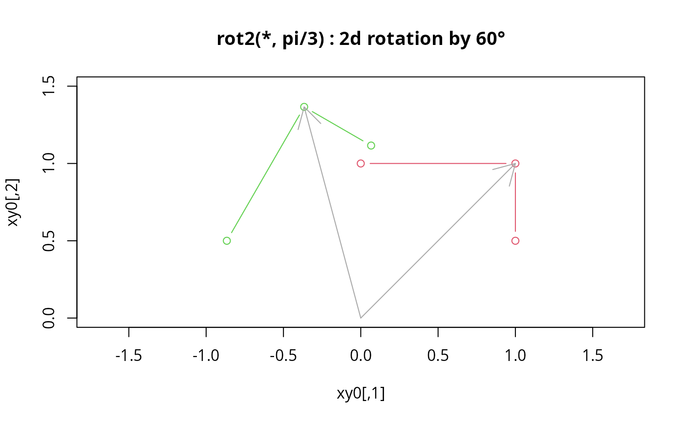 xlim=c(-1,1), ylim=c(0,1.5), main = "rot2(*, pi/3) : 2d rotation by 60°")