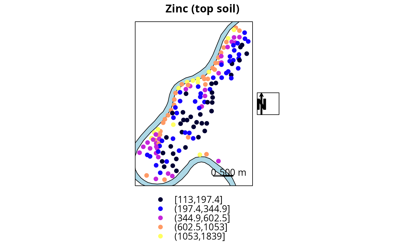 b2 = bubble(meuse, "zinc", maxsize = 1.5, main = "zinc concentrations (ppm)",