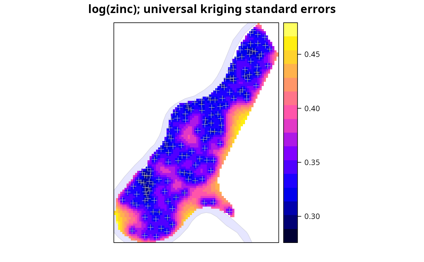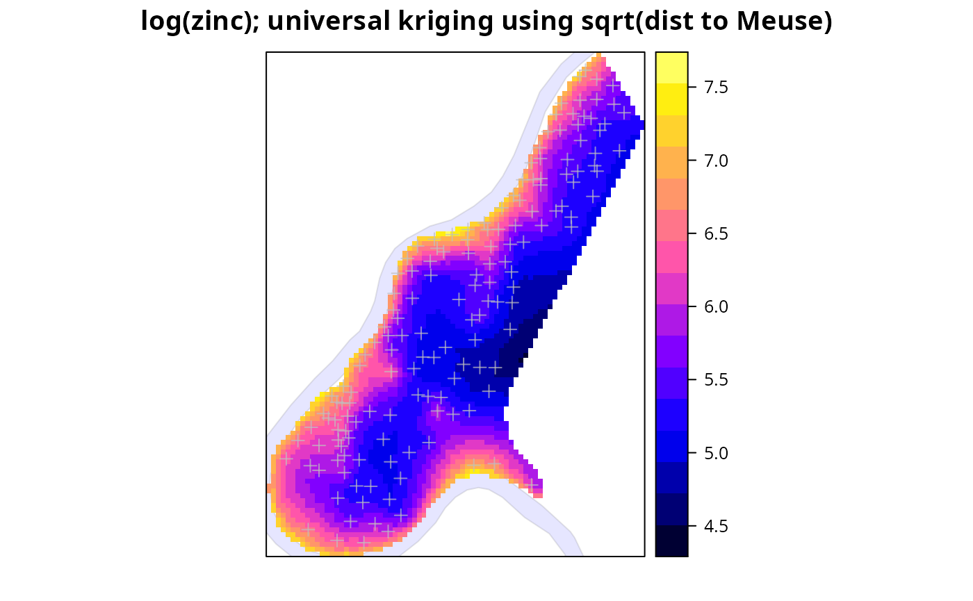 zn.uk = krige(log(zinc)~sqrt(dist), meuse, meuse.grid, model = uk.model, debug.level = 0)