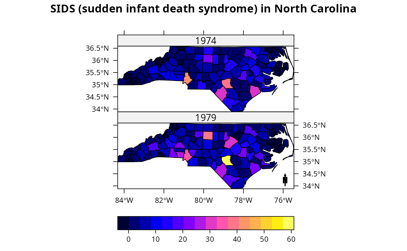 spplot(nc, c("SID74", "SID79"), names.attr = c("1974","1979"),