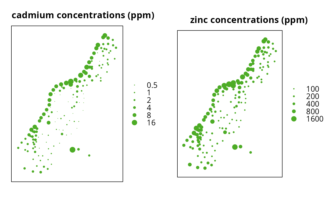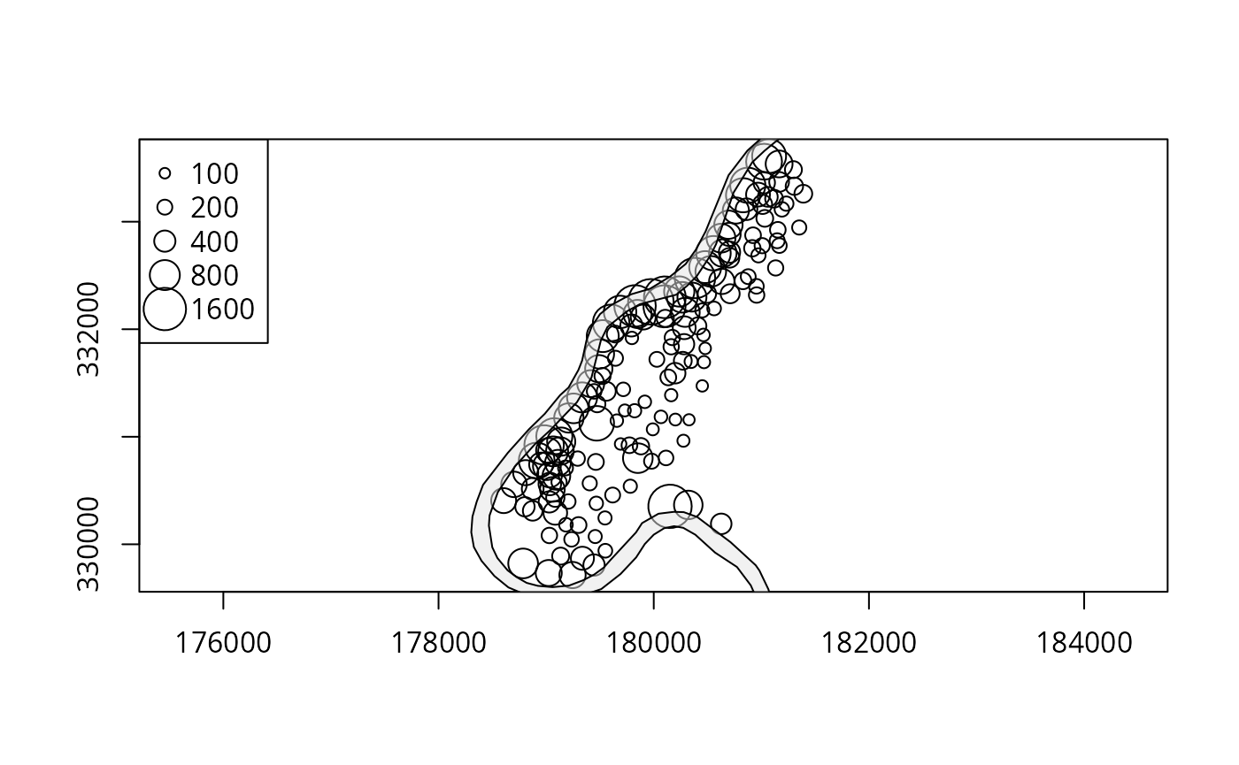 plot(meuse, pch = 1, cex = sqrt(meuse$zinc)/12, axes = TRUE)