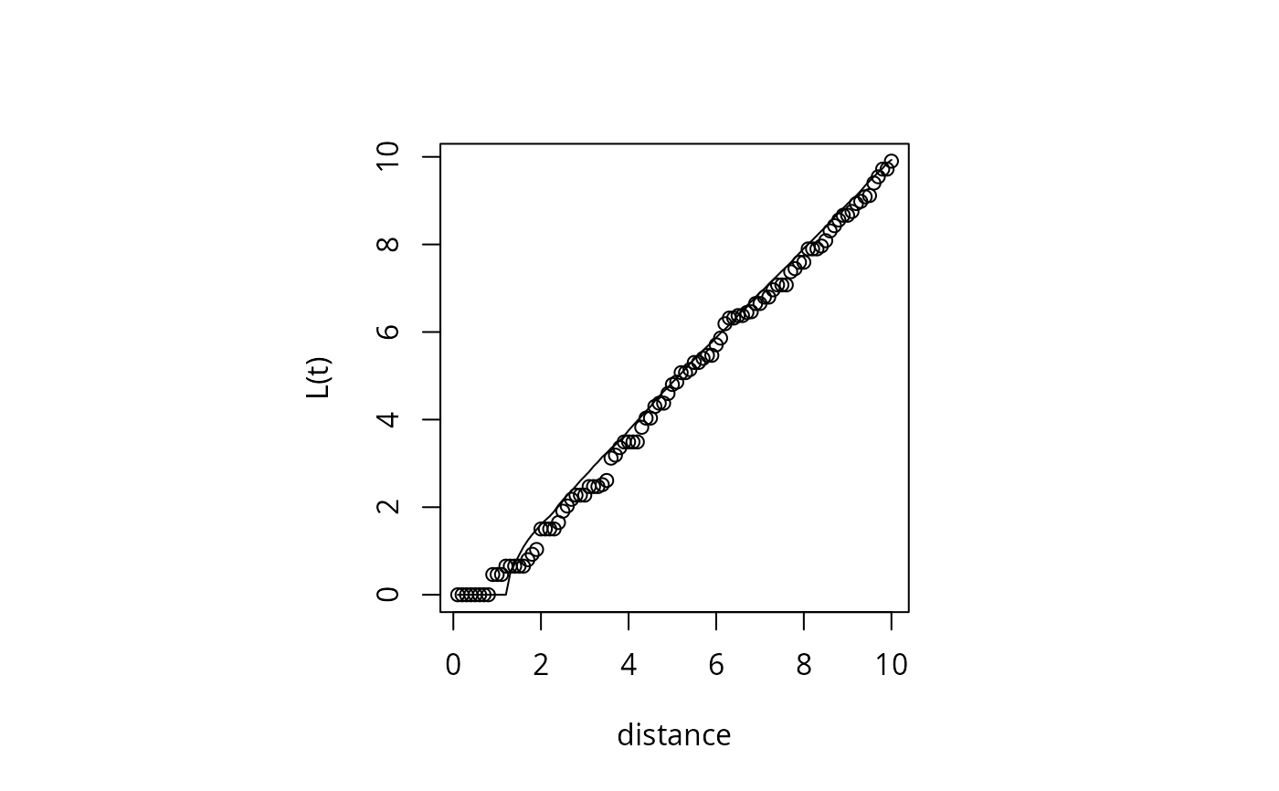 plot(Kfn(towns, 10), type = "b", xlab = "distance", ylab = "L(t)")