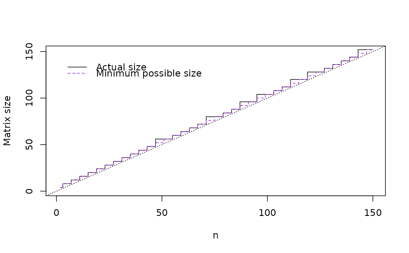 ylab="Matrix size",xlab="n",xlim=c(1,150),ylim=c(1,150))