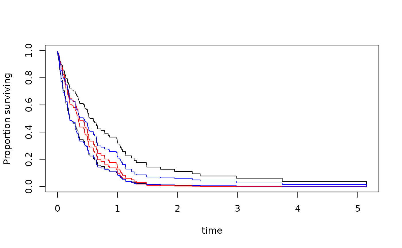 s2<-svykm(Surv(time,status>0)~group, design=des)