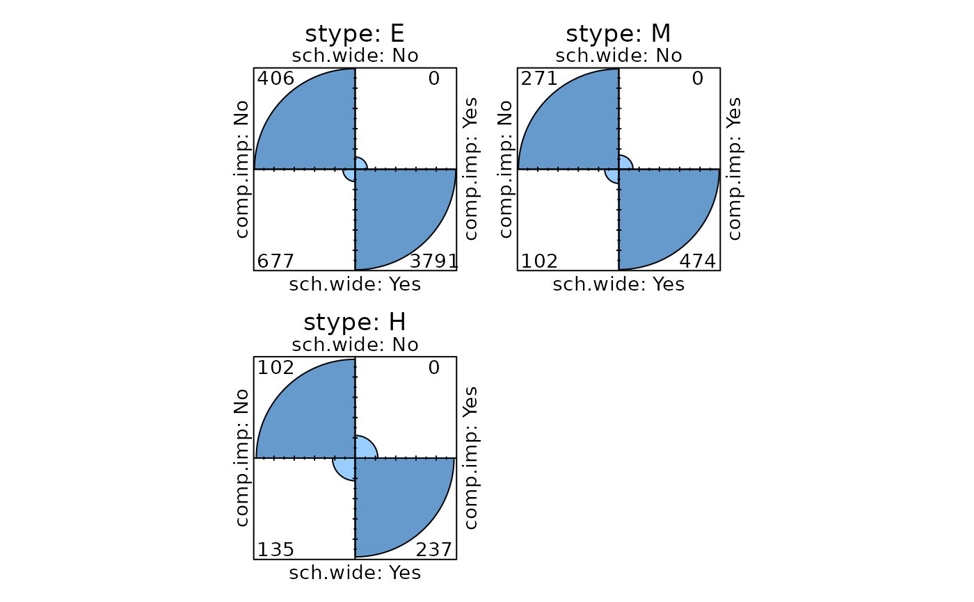 fourfoldplot(svytable(~sch.wide+comp.imp+stype,design=dclus1,round=TRUE), conf.level=0)