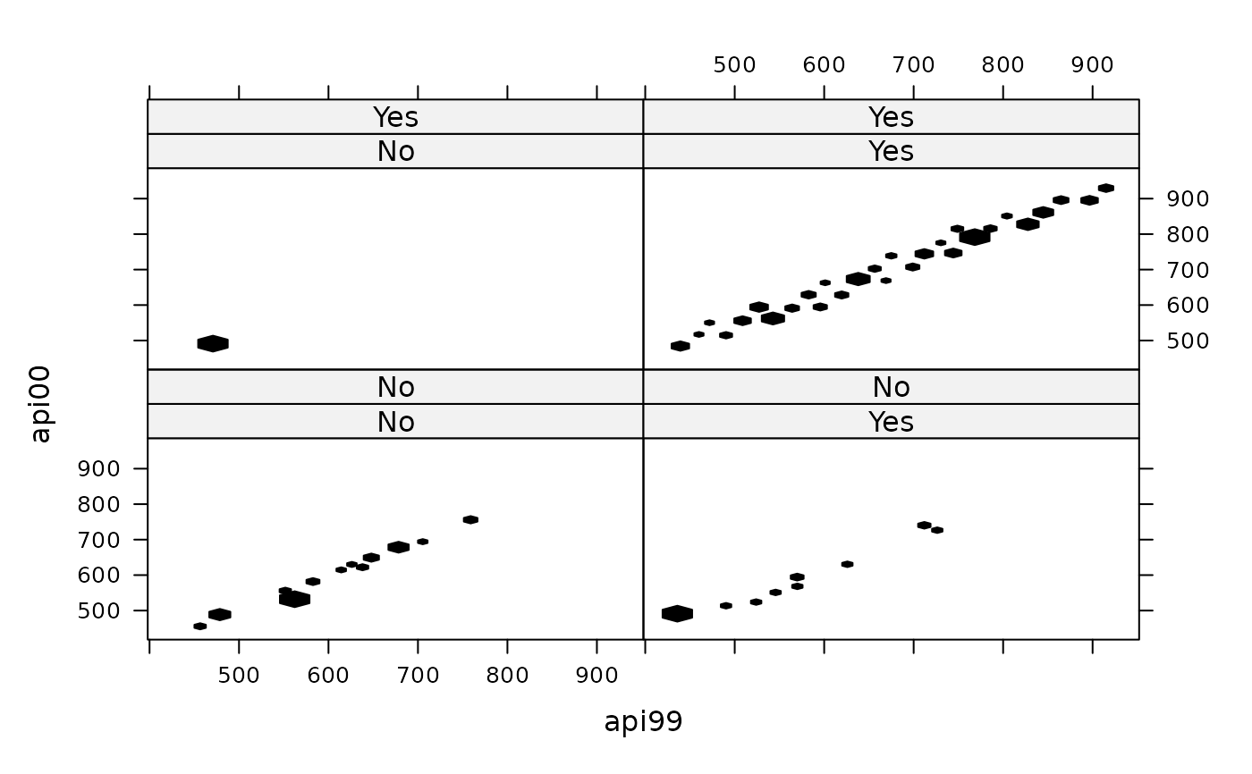 svycoplot(api00~api99|sch.wide*comp.imp, design=dclus2, style="hexbin", hexscale="absolute")