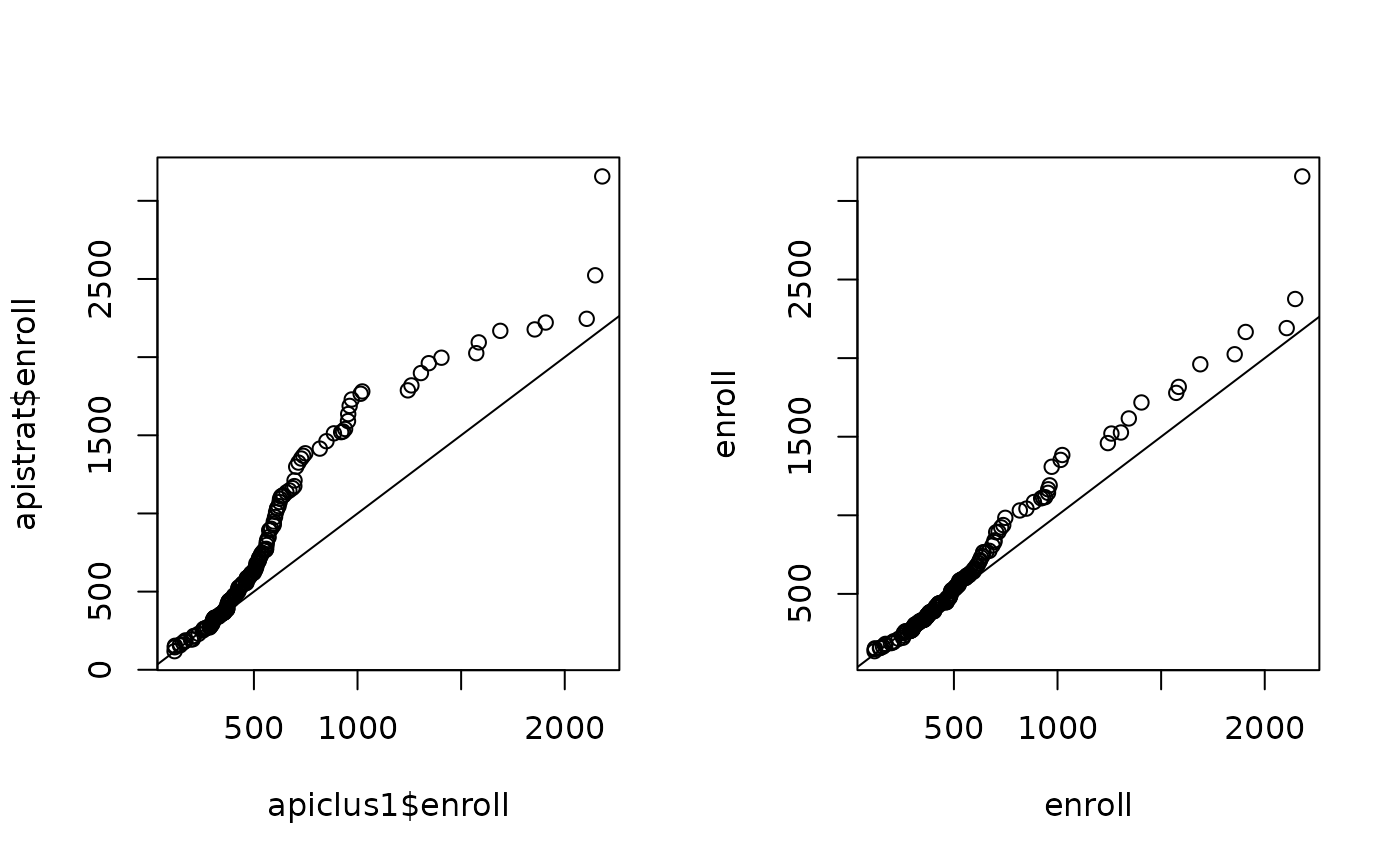qqplot(apiclus1$enroll, apistrat$enroll); abline(0,1)