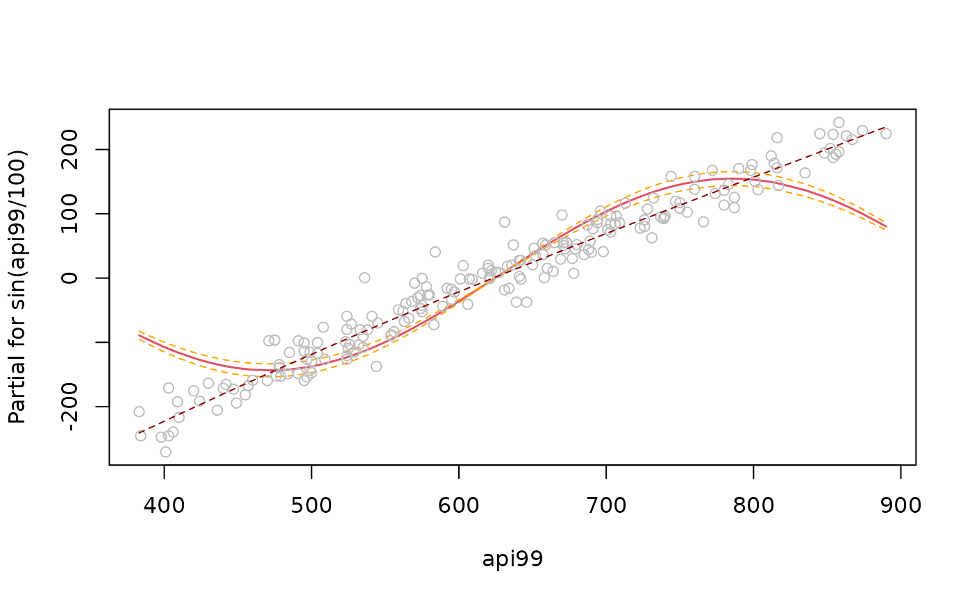 m<-svyglm(api00~sin(api99/100)+stype, design=dstrat)