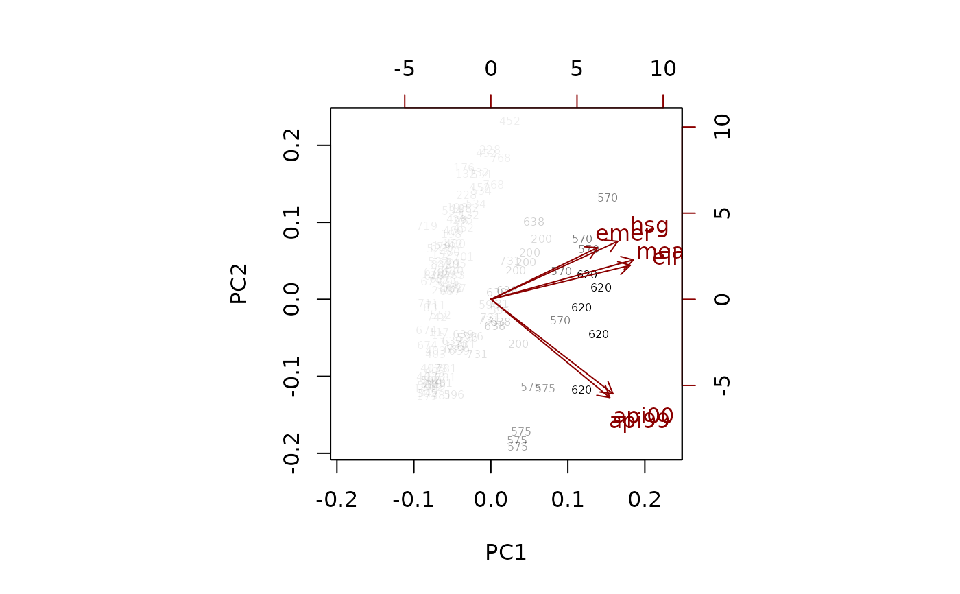 pc <- svyprcomp(~api99+api00+ell+hsg+meals+emer, design=dclus2,scale=TRUE,scores=TRUE)