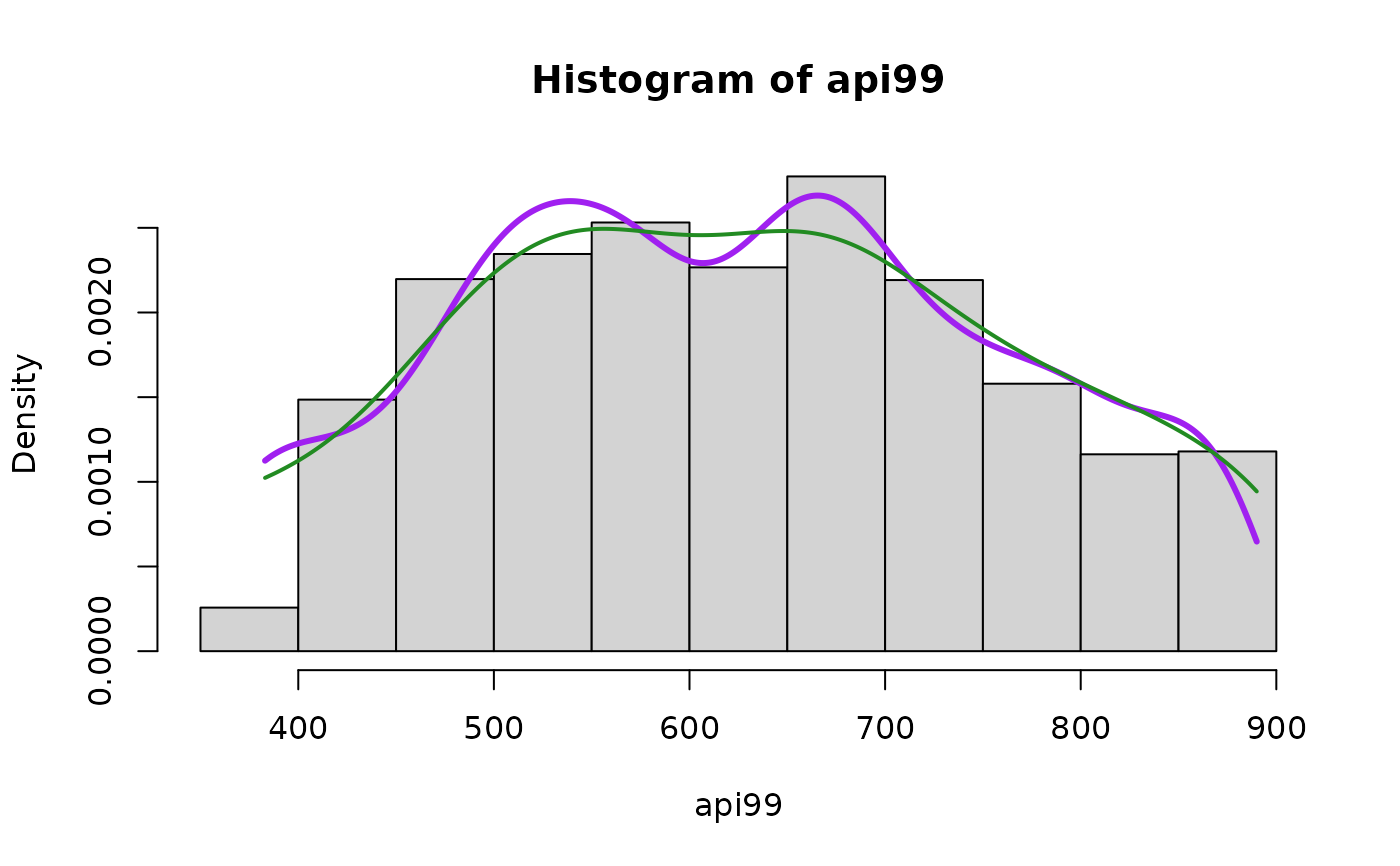 dens<-svysmooth(~api99, dstrat,bandwidth=30)