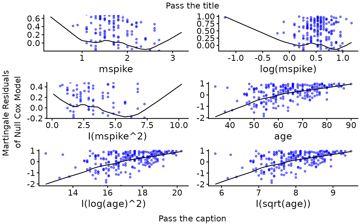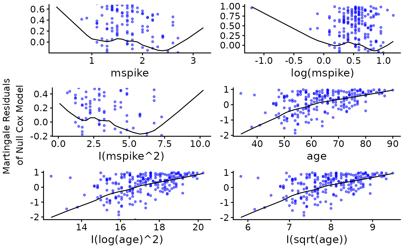 ggcoxfunctional(res.cox, data = mgus, point.col = "blue", point.alpha = 0.5)