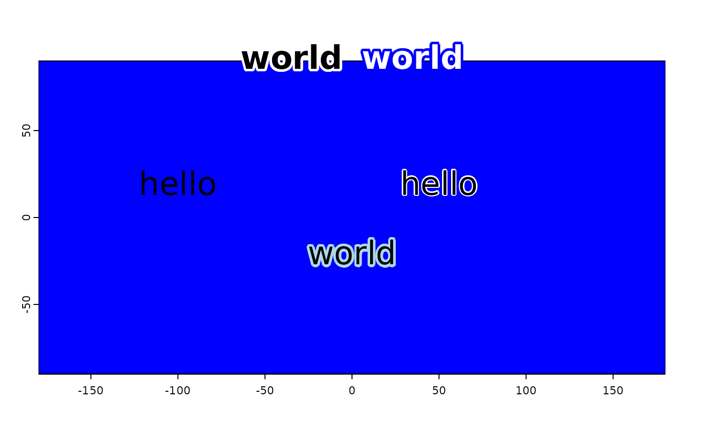 halo(0, 90, "world", col="white", font=2, hc="blue", cex=2, hw=.2, xpd=TRUE, pos=4)