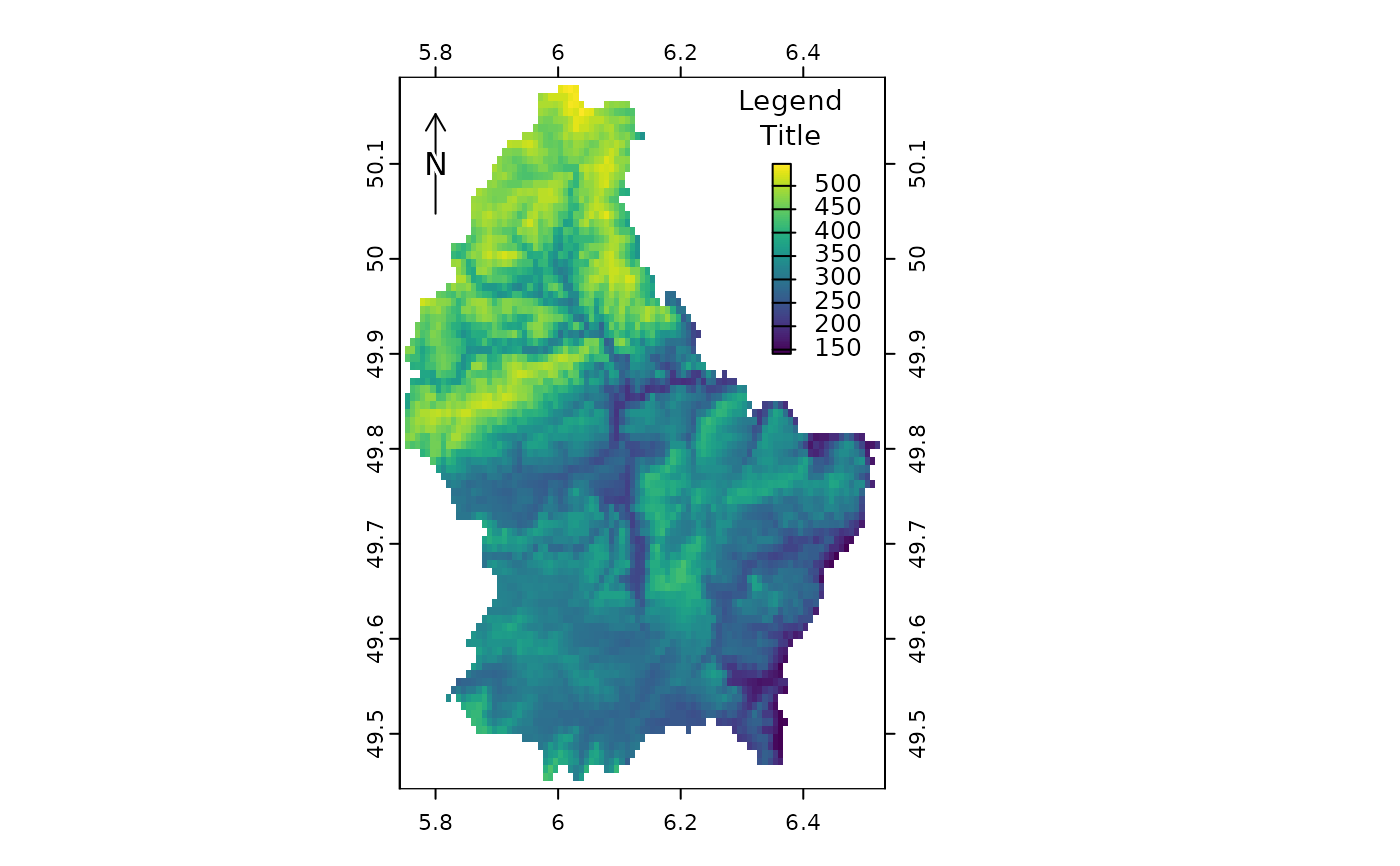 plot(r, plg=list(x=6.35, y = c(49.9, 50.1), title="Legend\nTitle", title.cex=0.9),
