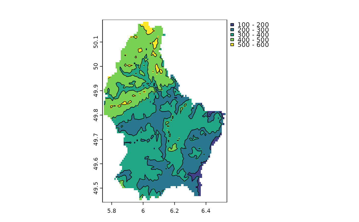as.contour(x, maxcells=100000, ...)SpatRaster. Only the first layer is used
