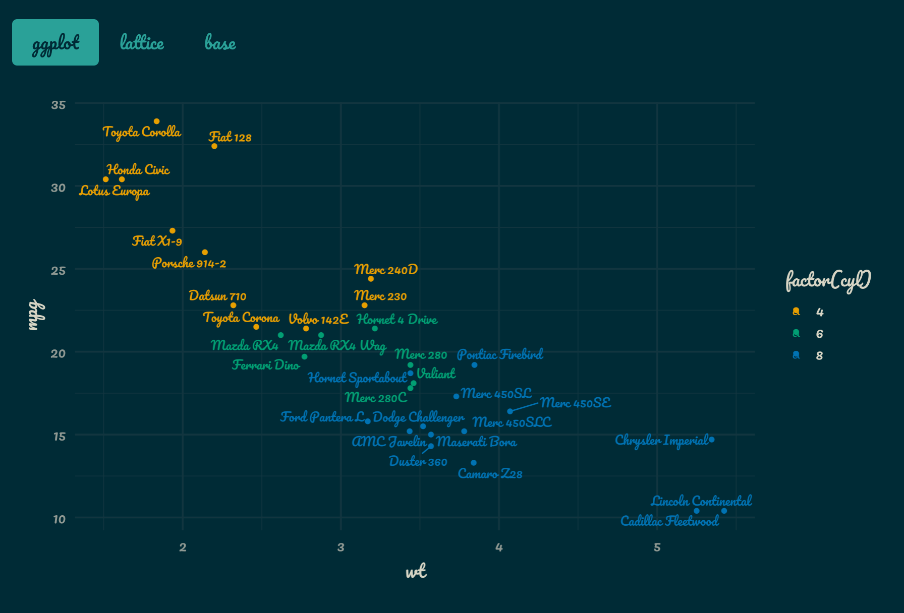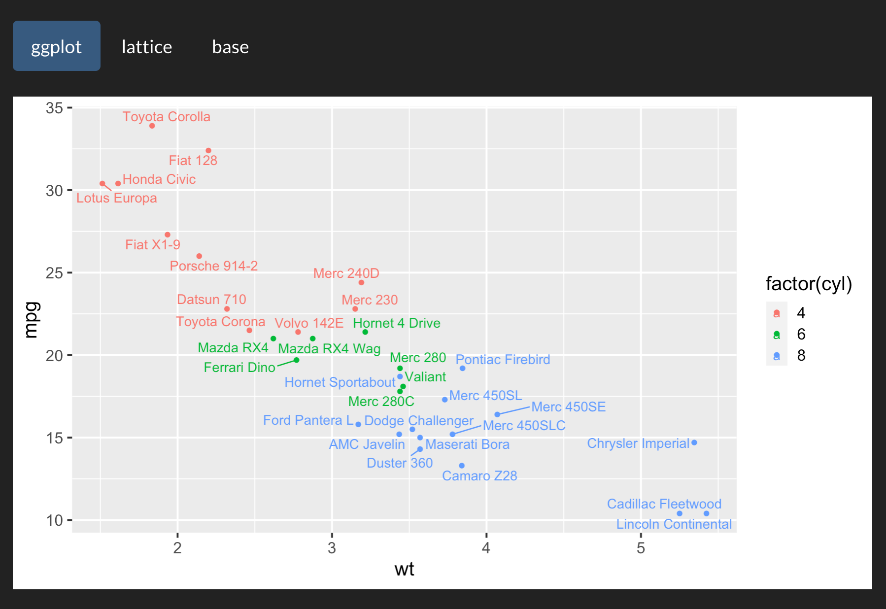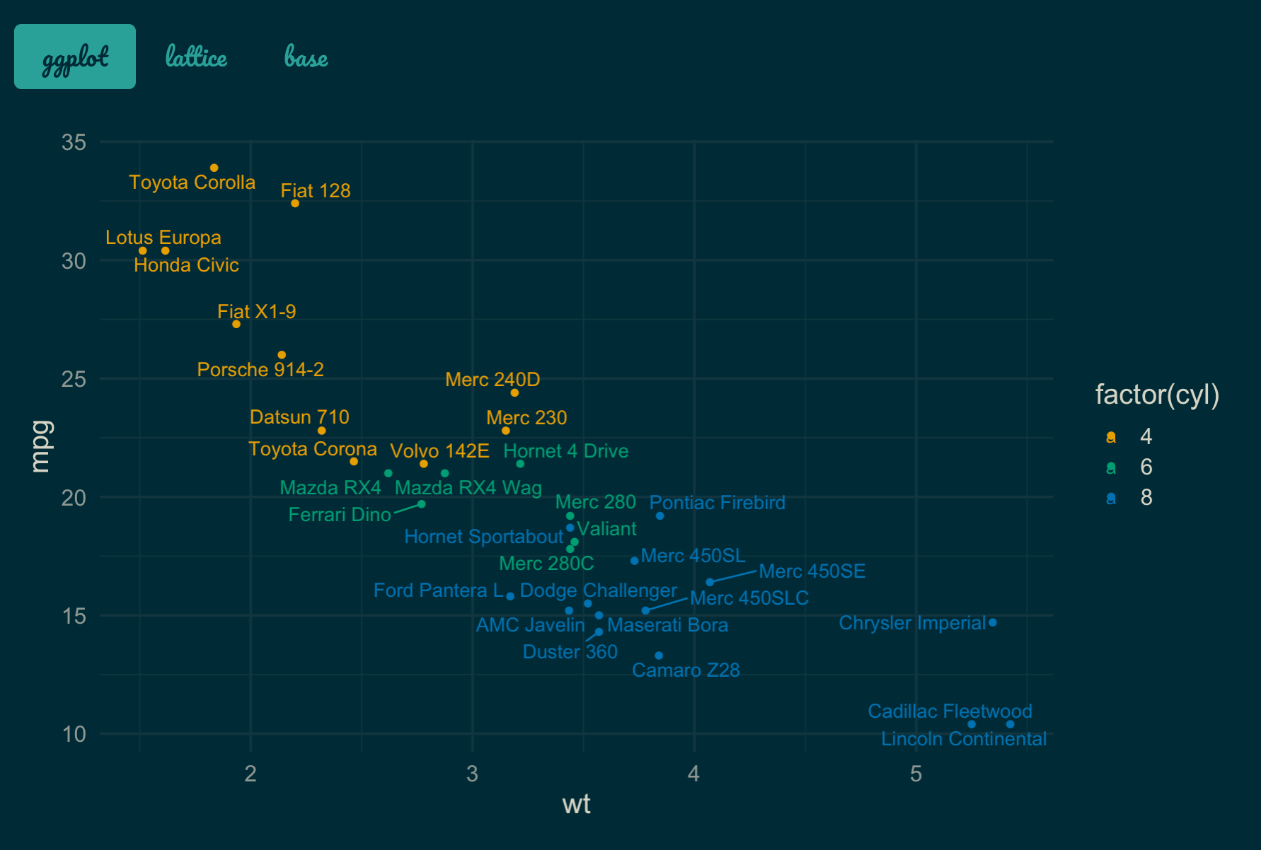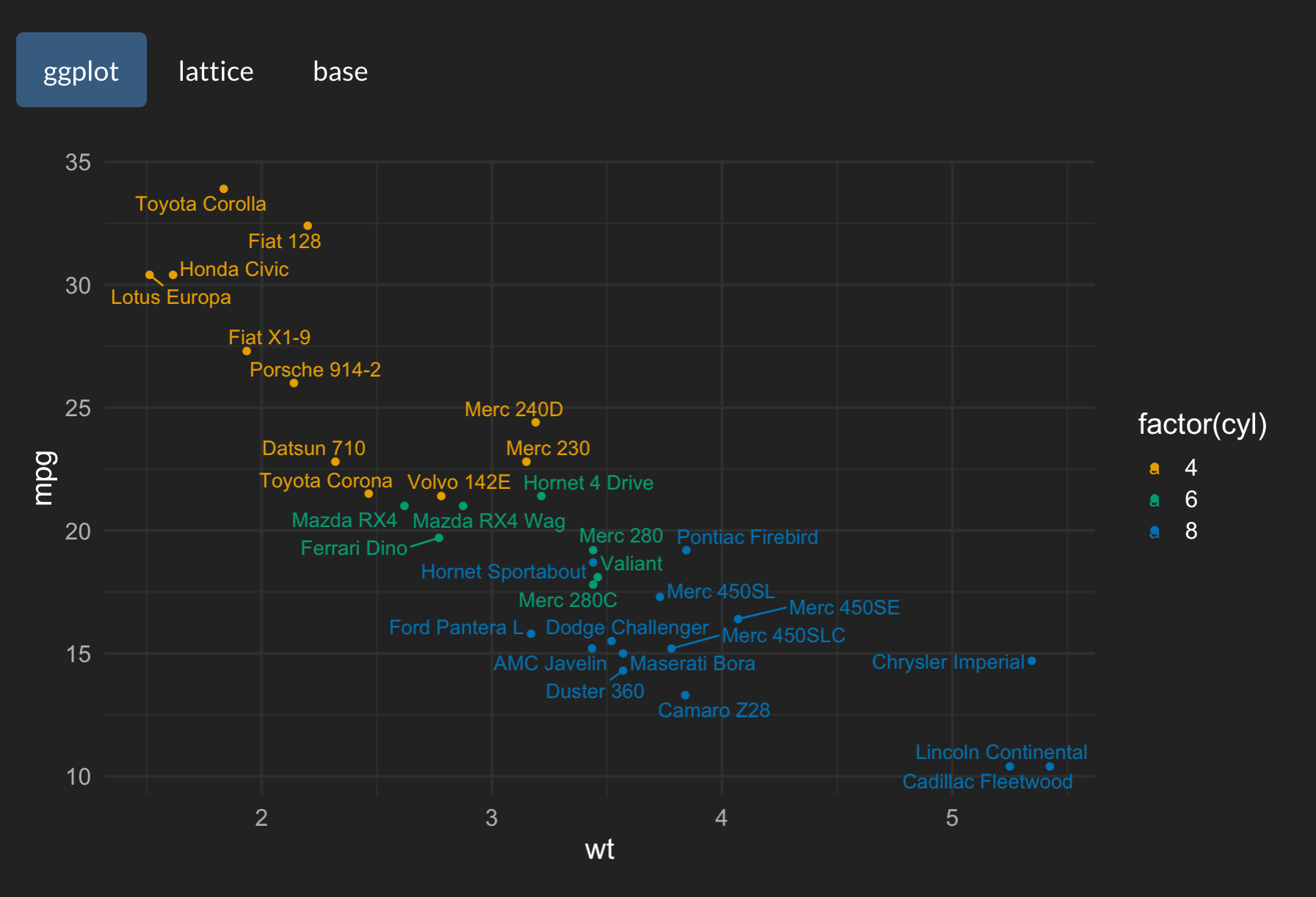 ggplot(mtcars, aes(wt, mpg, label = rownames(mtcars), color = factor(cyl))) +