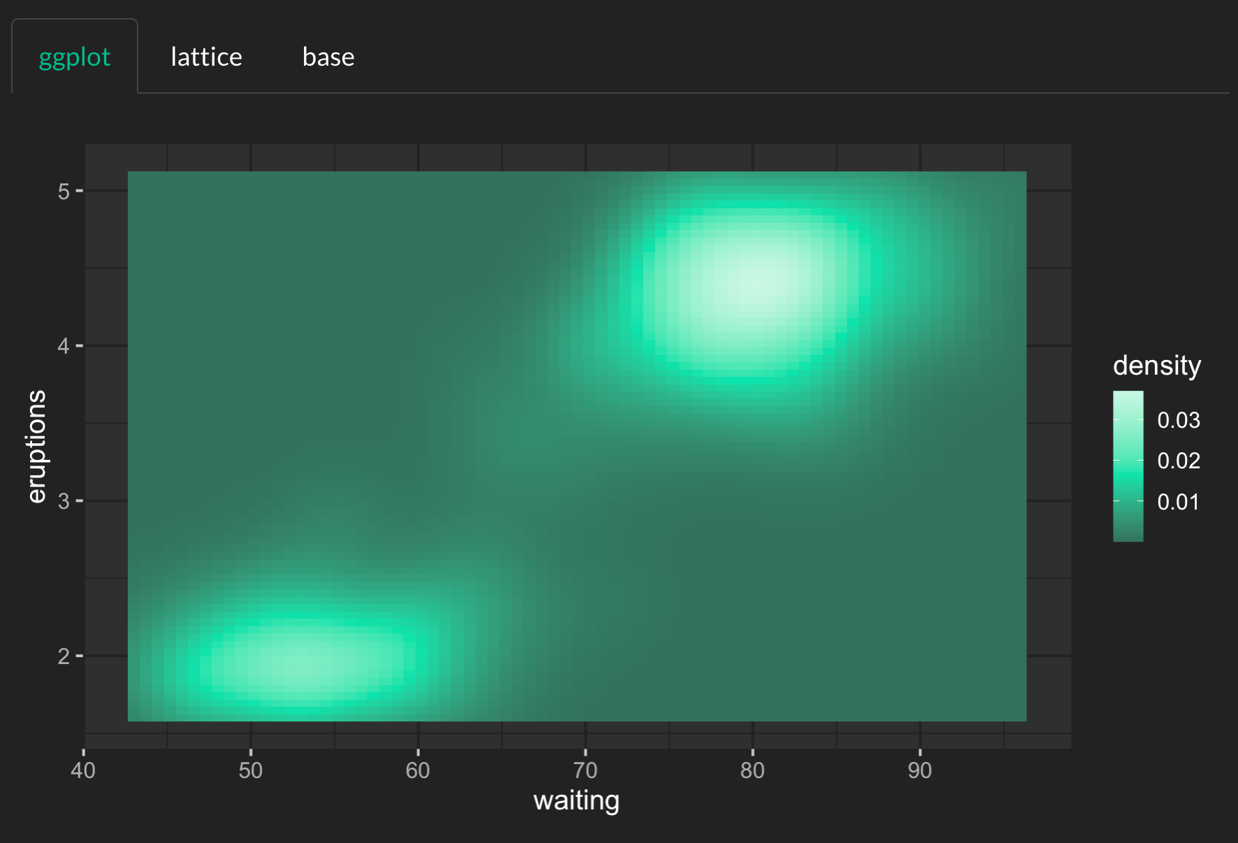 ggplot(faithfuld, aes(waiting, eruptions)) +