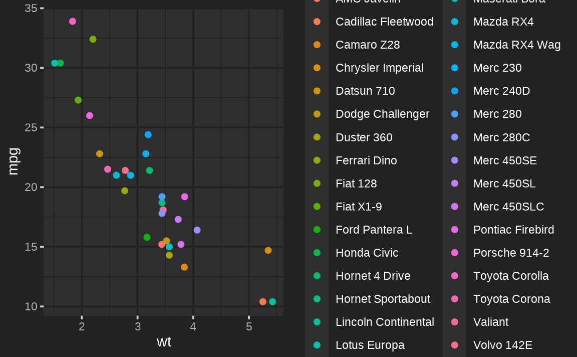 ggplot(mtcars, aes(wt, mpg, color = row.names(mtcars))) + geom_point()
