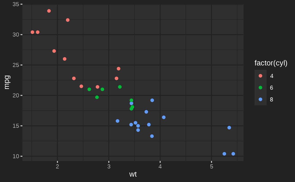 ggplot(mtcars, aes(wt, mpg, color = factor(cyl))) + geom_point()