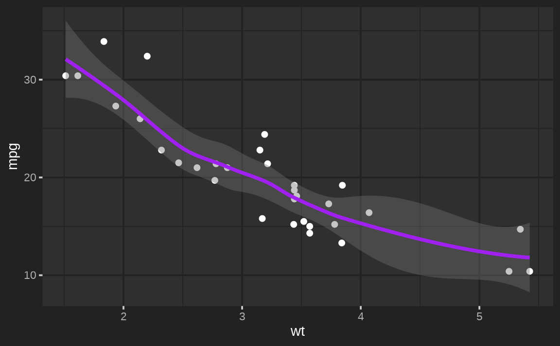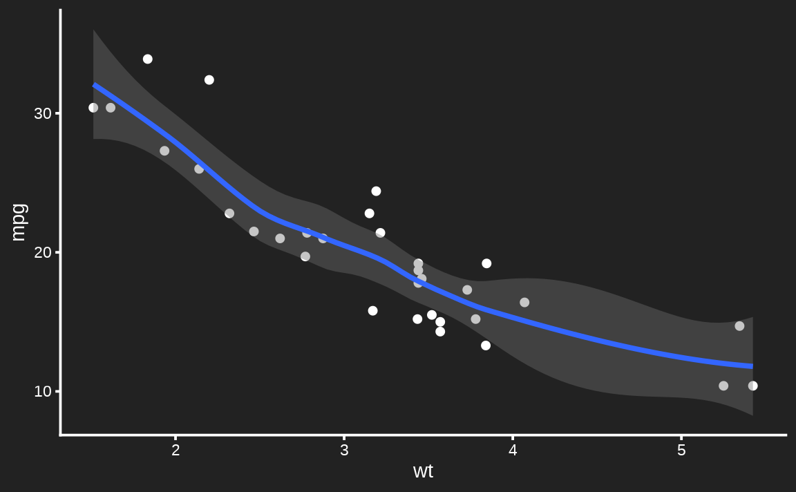 ggsmooth <- ggplot(mtcars, aes(wt, mpg)) + geom_point() + geom_smooth()