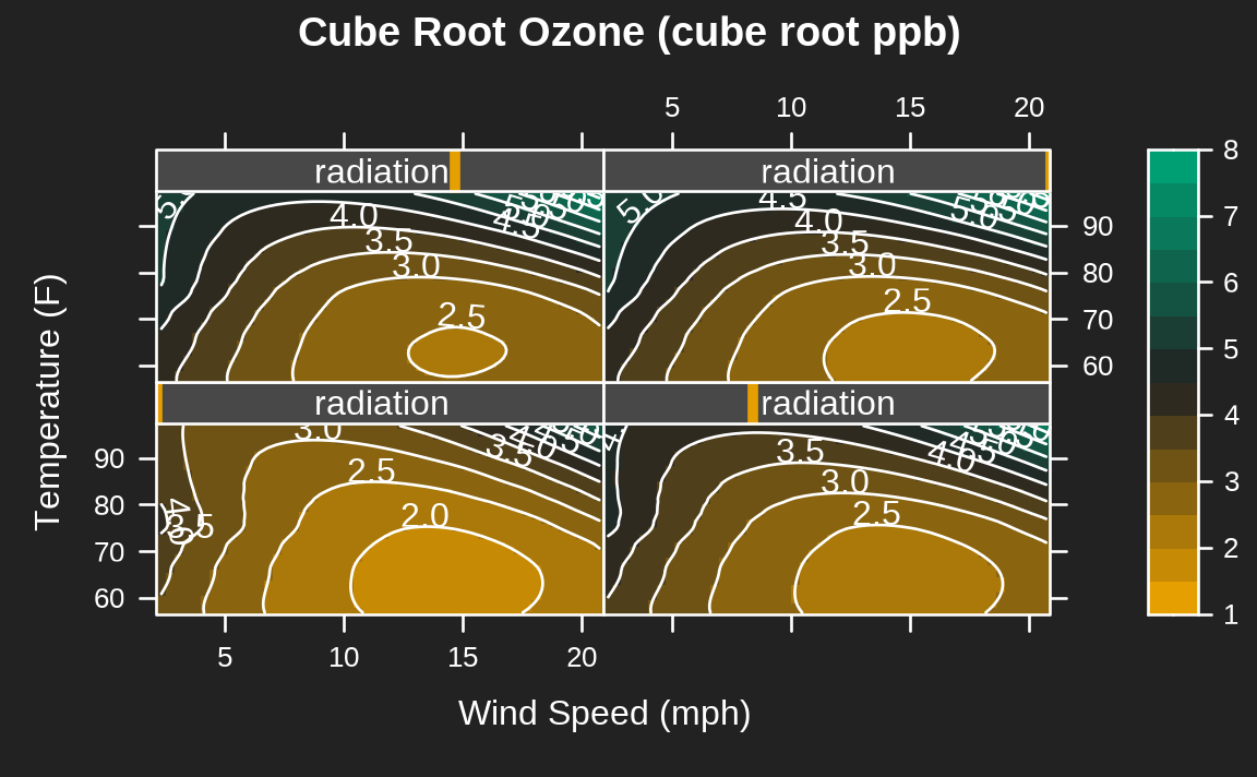 contourplot(fit ~ wind * temperature | radiation, data = grid,