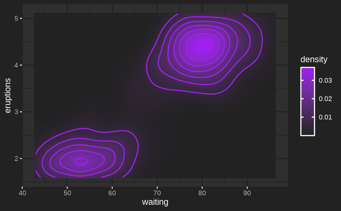 ggcontour <- ggplot(faithfuld, aes(waiting, eruptions, z = density)) +