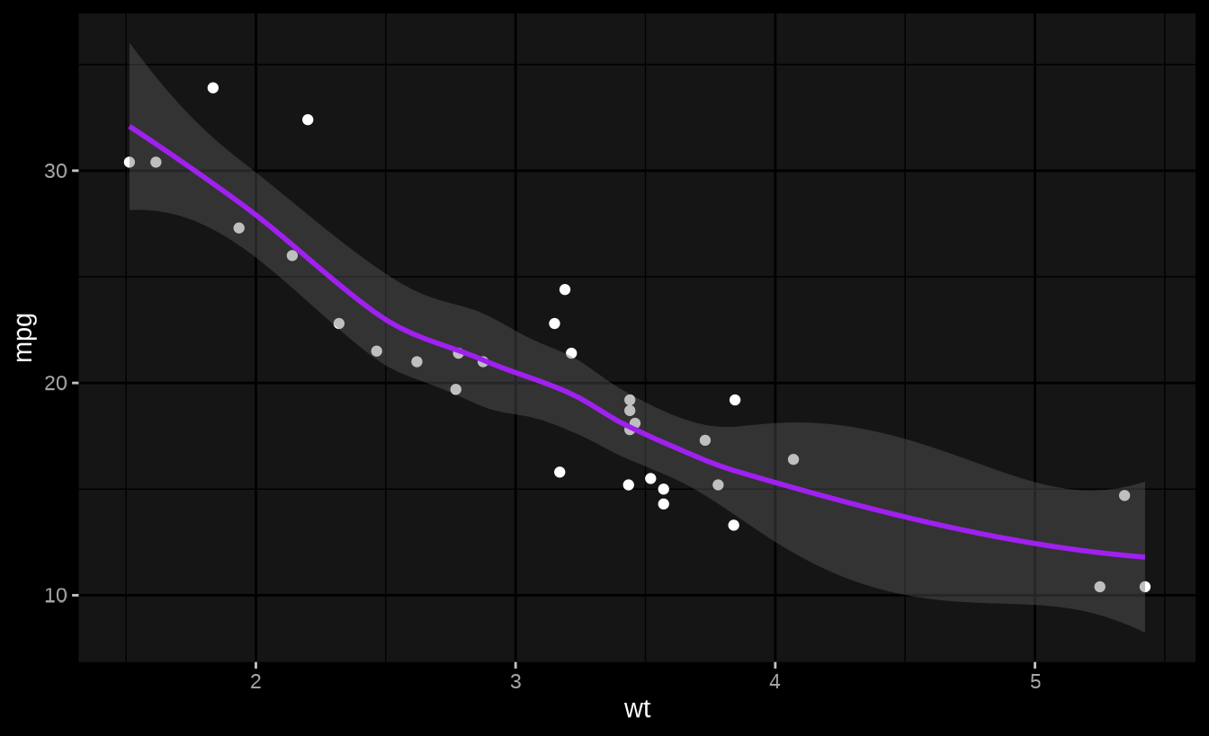 ggsmooth <- ggplot(mtcars, aes(wt, mpg)) + geom_point() + geom_smooth()