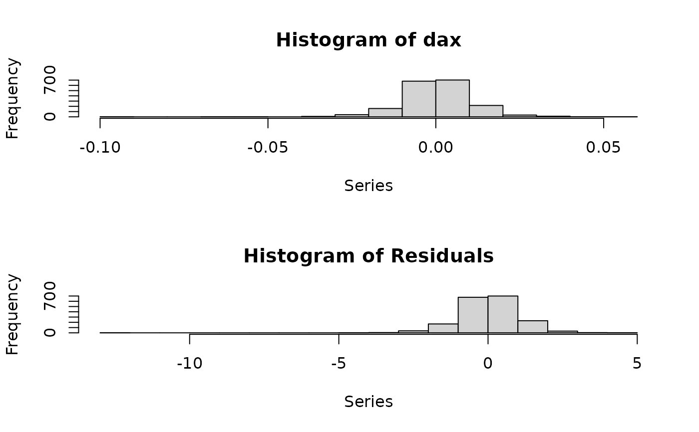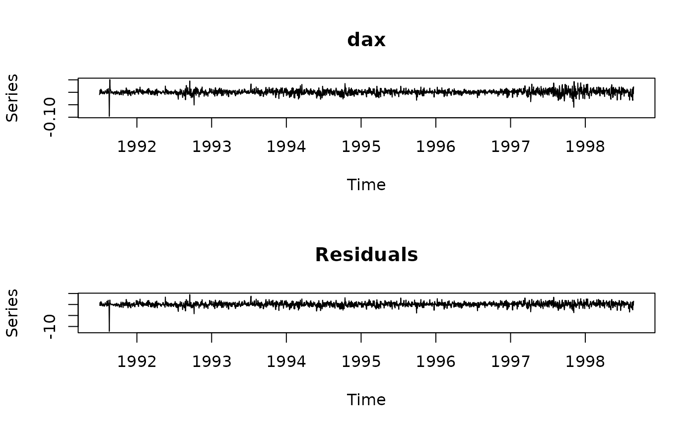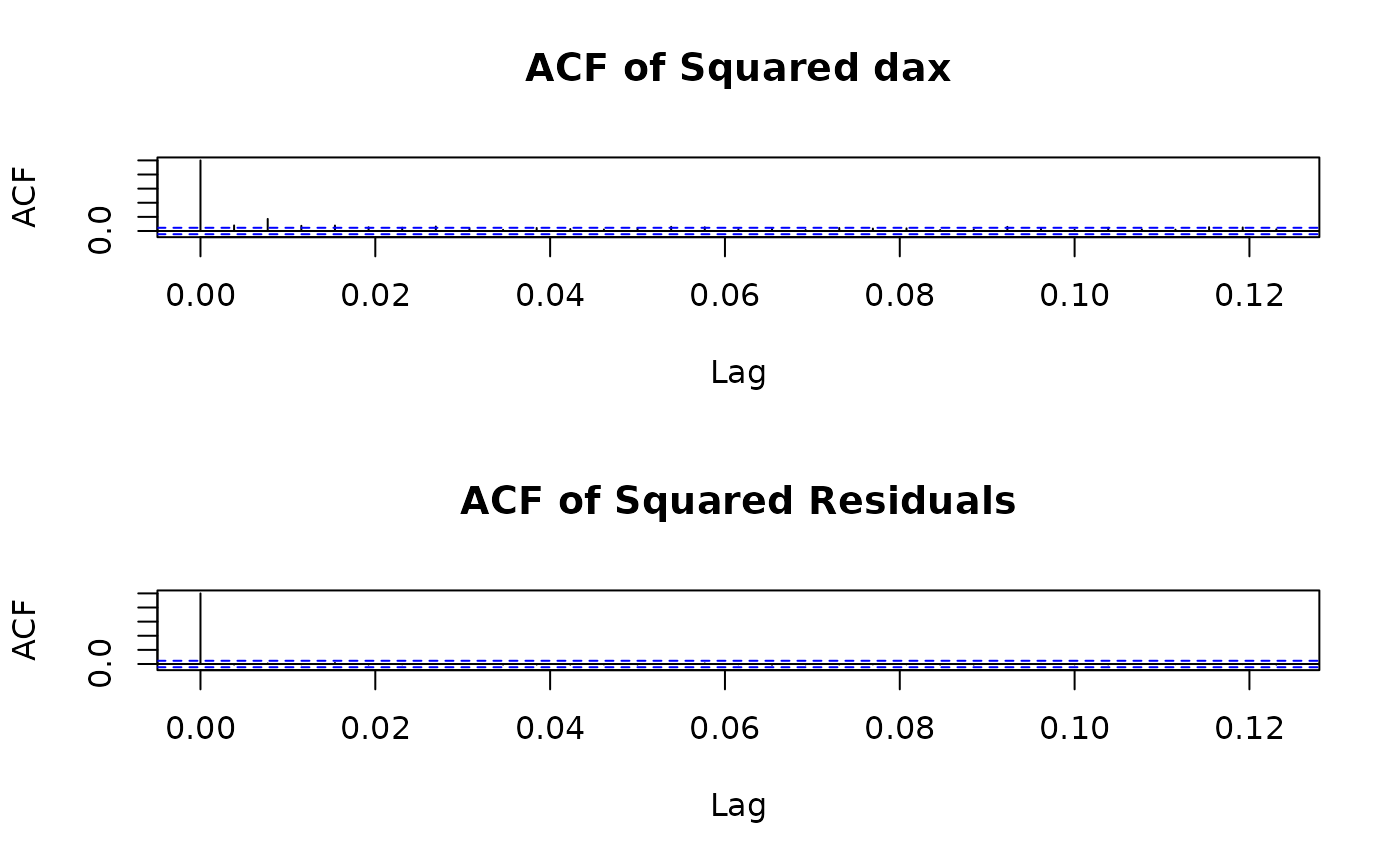 dax.garch <- garch(dax) # Fit a GARCH(1,1) to DAX returns