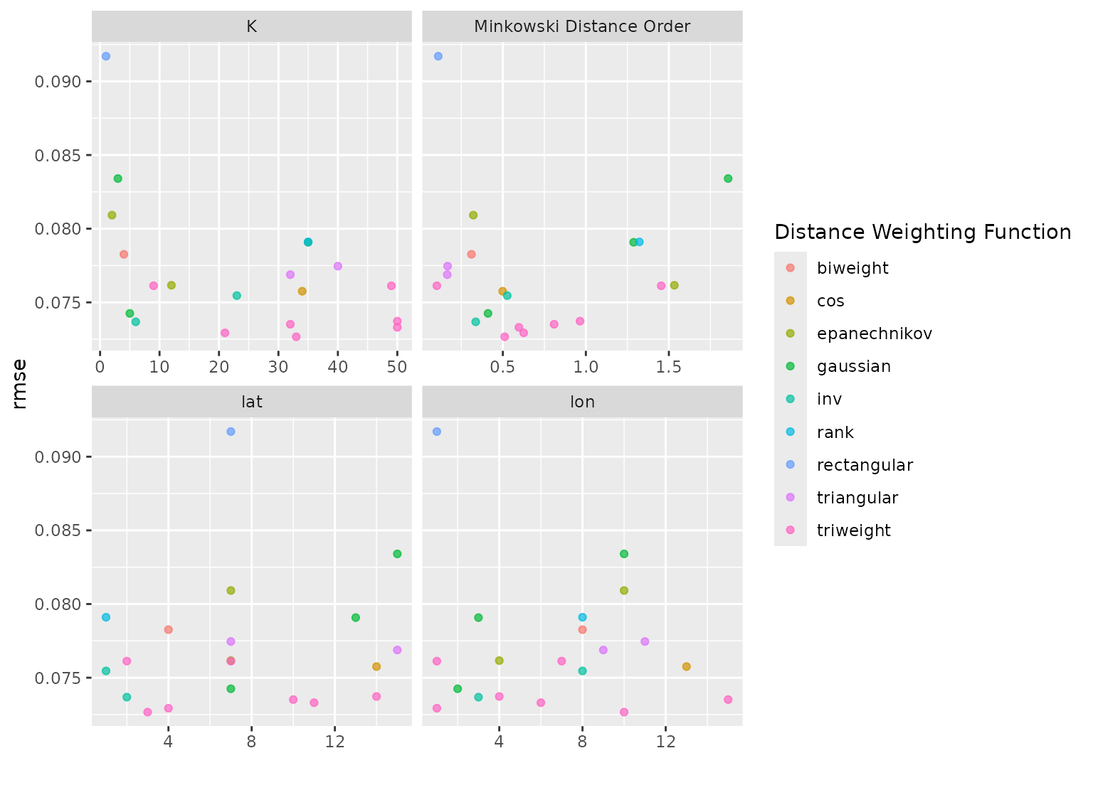 For regular grids with one or more numeric tuning parameters, the parameter with the most unique values is used on the x-axis. If there are categorical parameters, the first is used to color the geometries. All other parameters are used in column faceting.