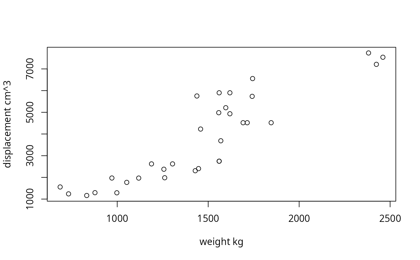 plot(x, y, xlab = NULL, ylab = NULL, ...)length one character; name of the variable to plot