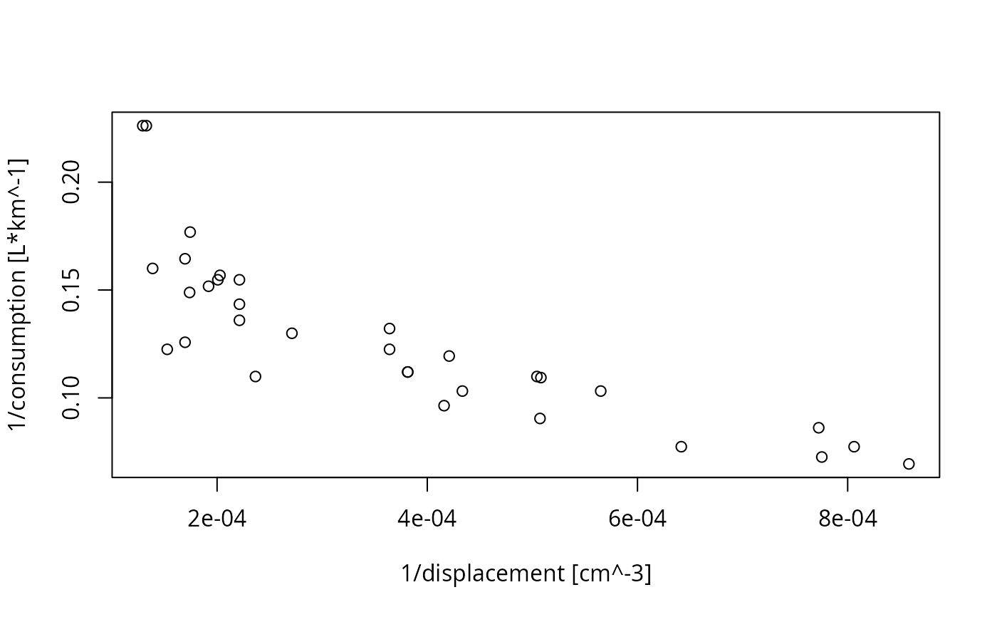 plot(displacement, consumption) # division in consumption