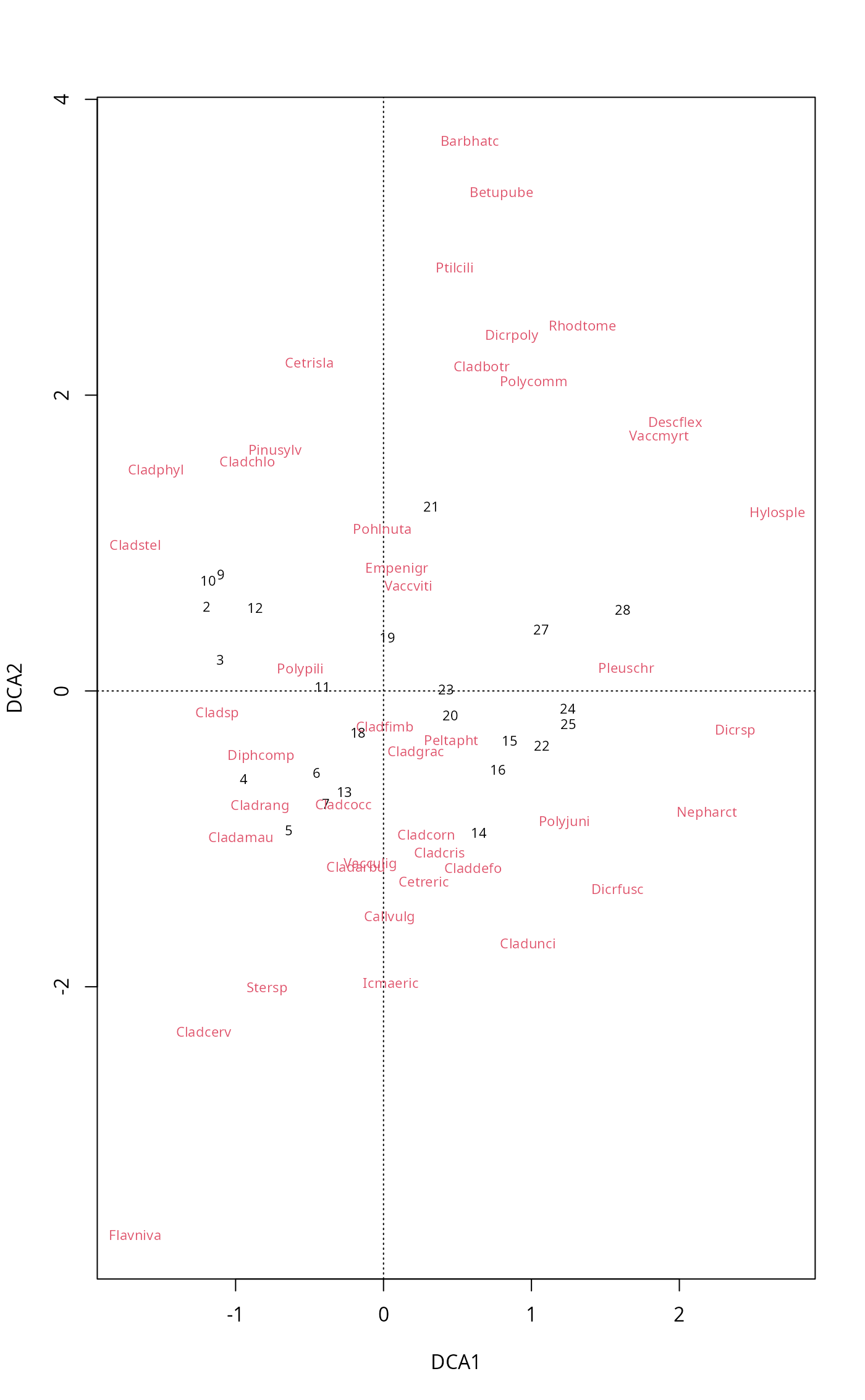 decorana(veg, iweigh=0, iresc=4, ira=0, mk=26, short=0,