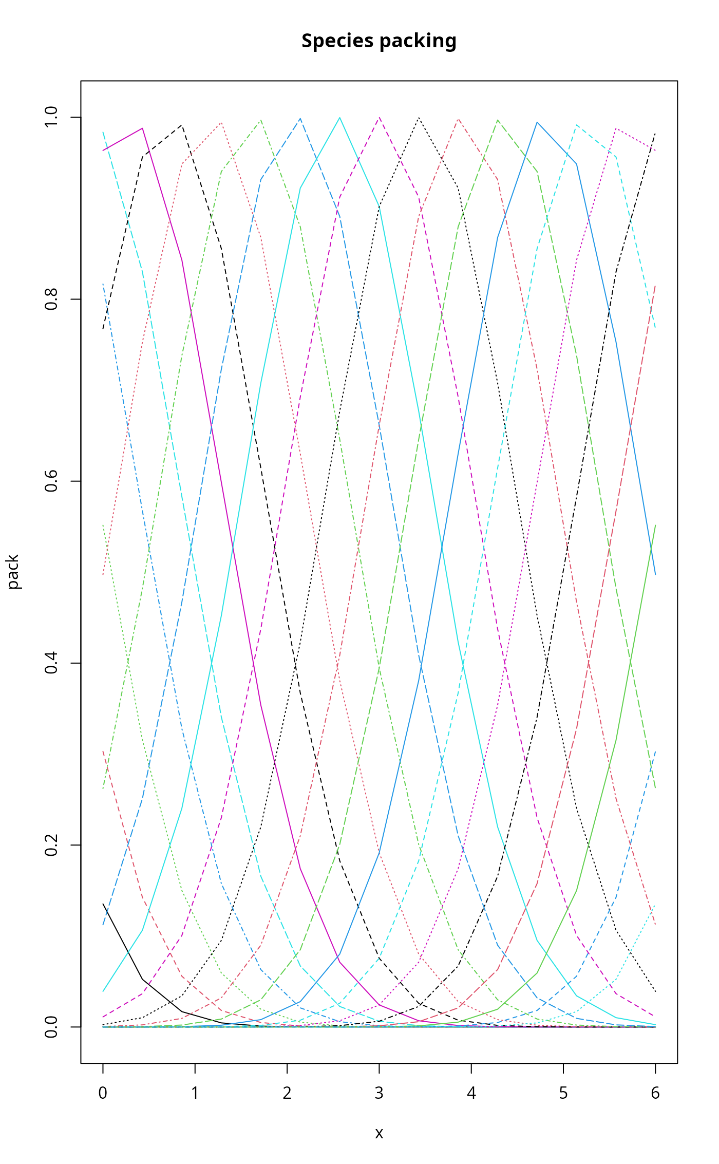 matplot(x, pack, type="l", main="Species packing")