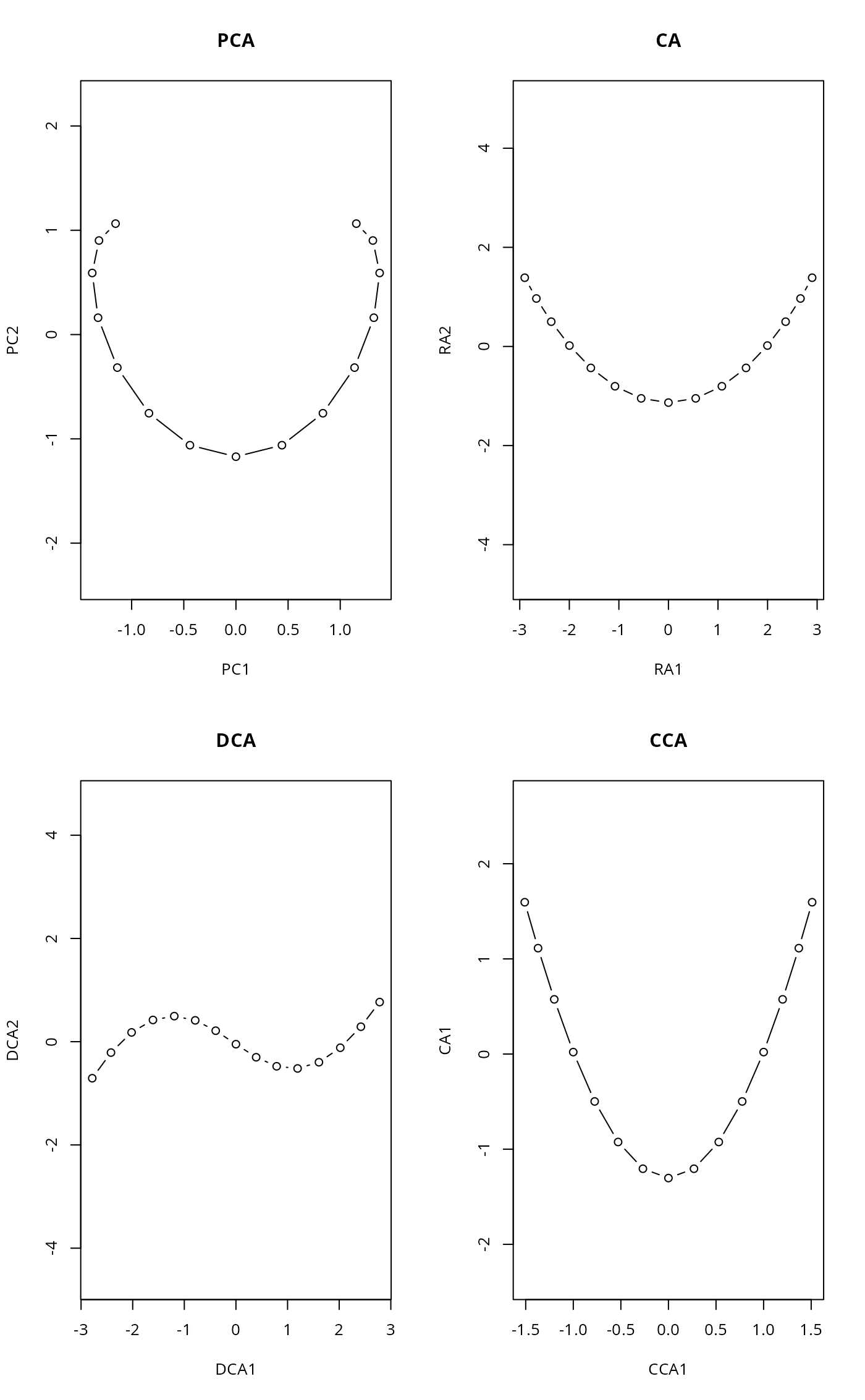 plot(scores(decorana(noisy)), type="b", main="DCA", asp=1)