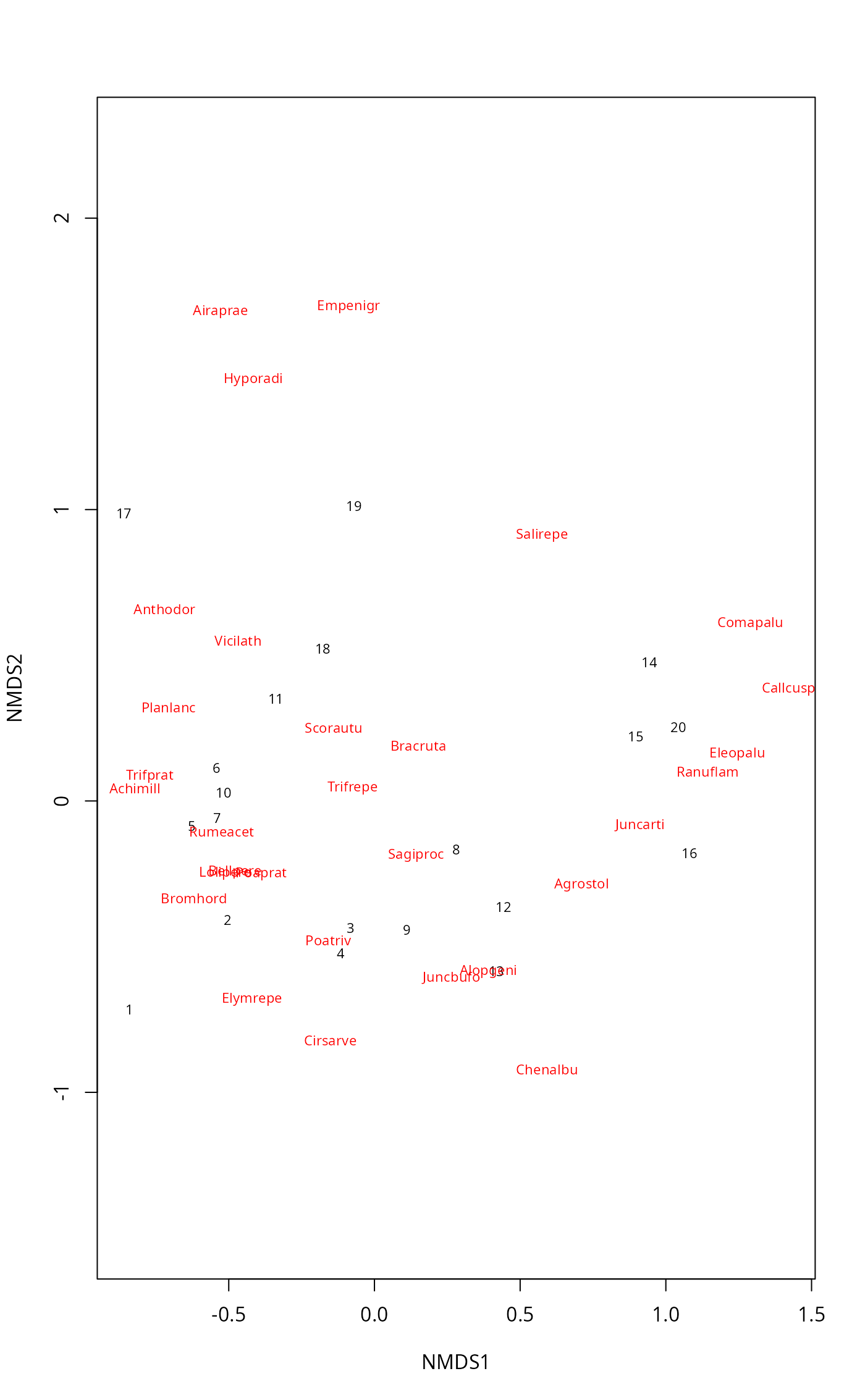 metaMDS(comm, distance = "bray", k = 2, try = 20, trymax = 20,