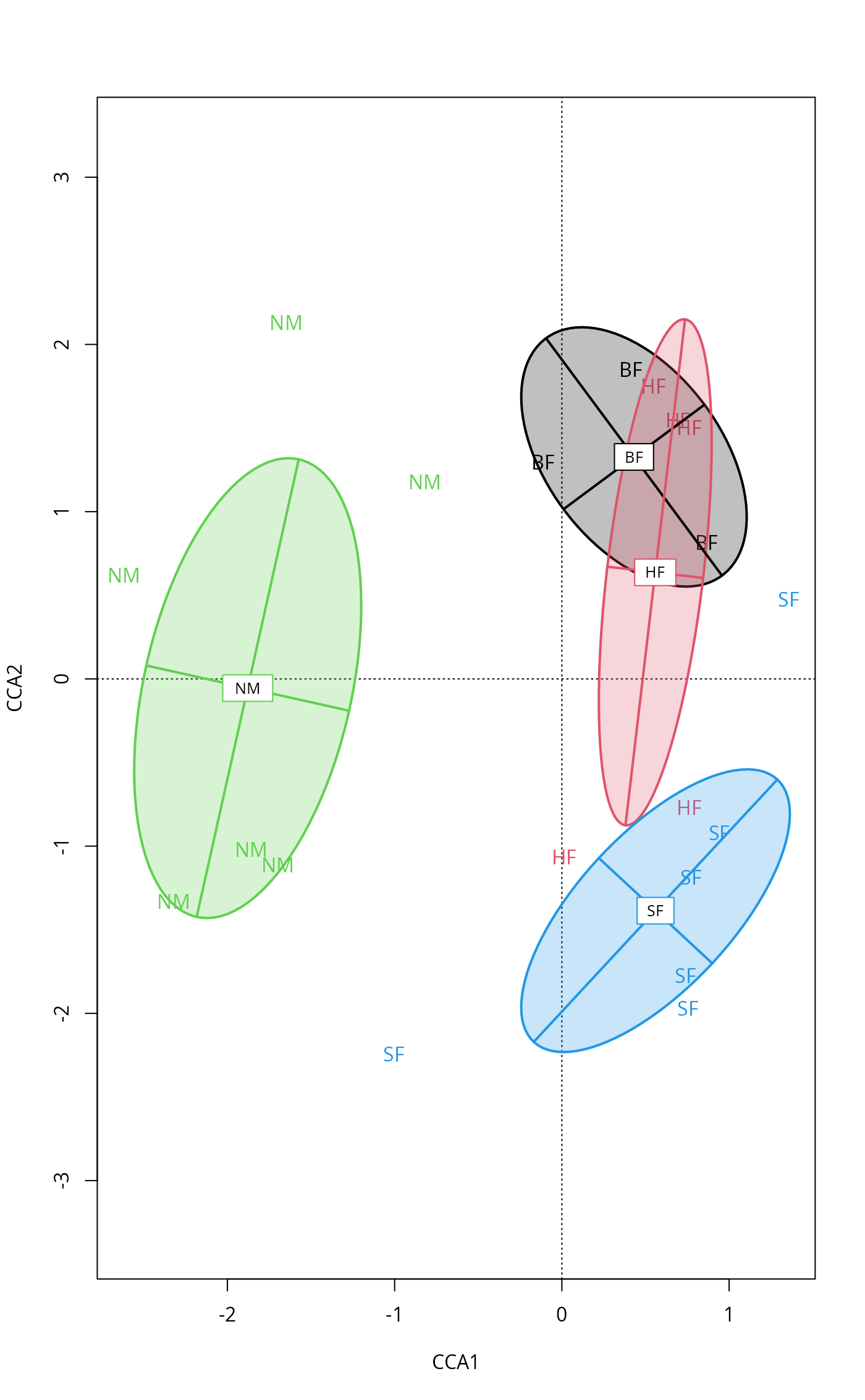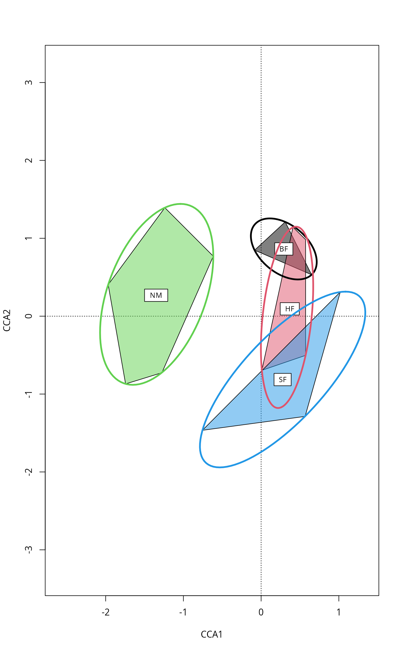 ordiellipse(ord, groups, display="sites", kind = c("sd","se", "ehull"),