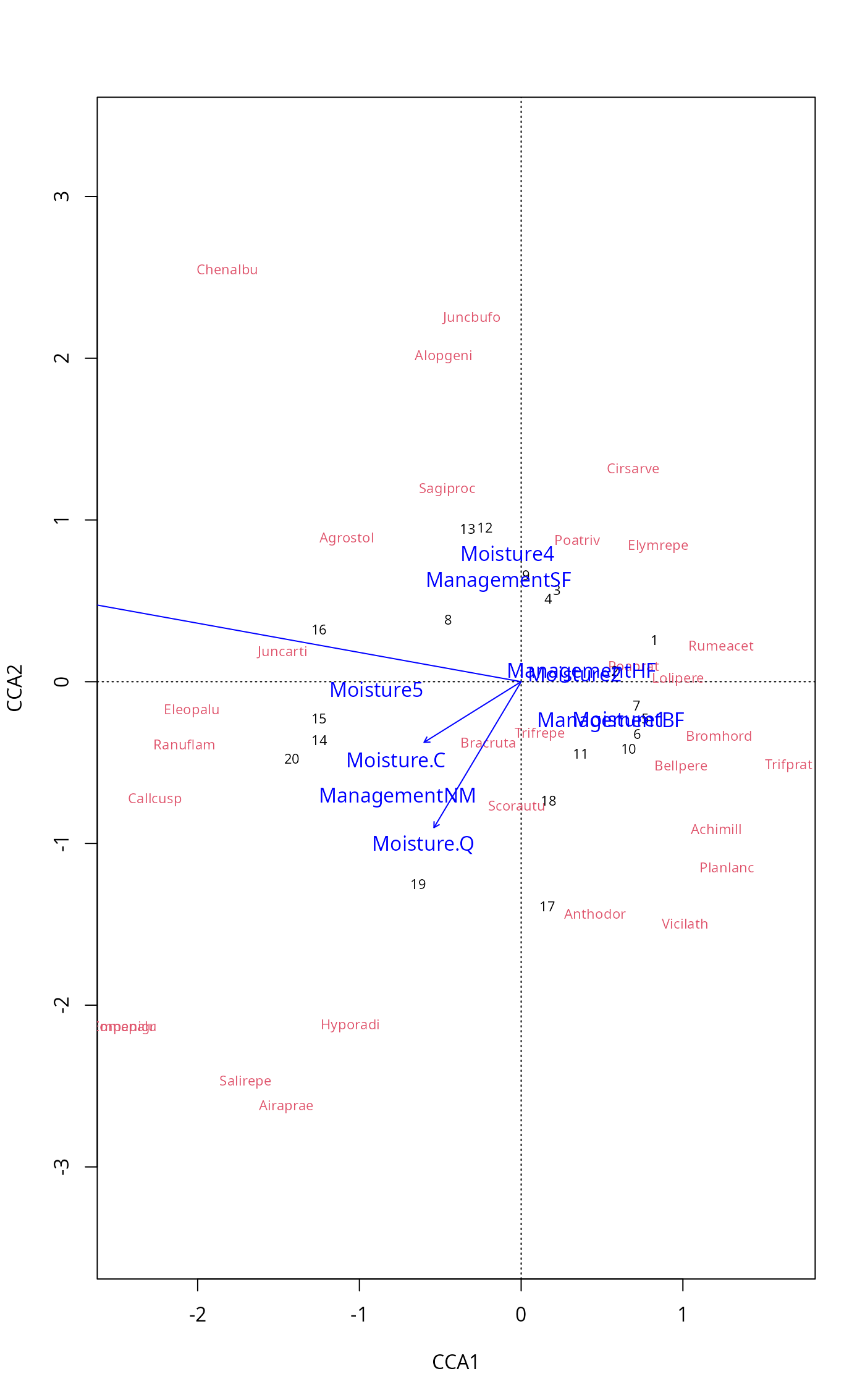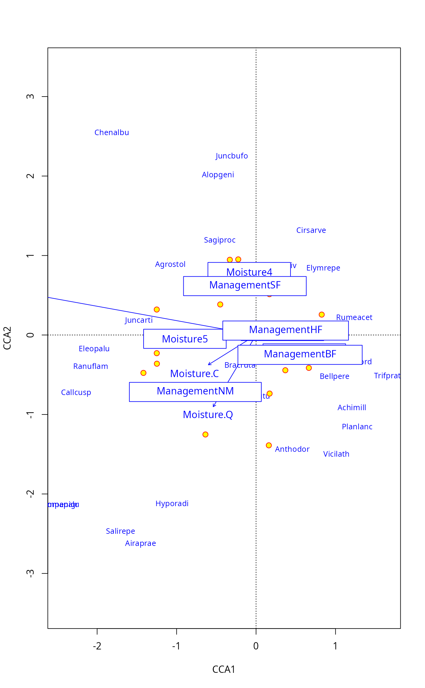 scrs <- scores(rda(dune ~ A1 + Moisture + Management, dune.env),