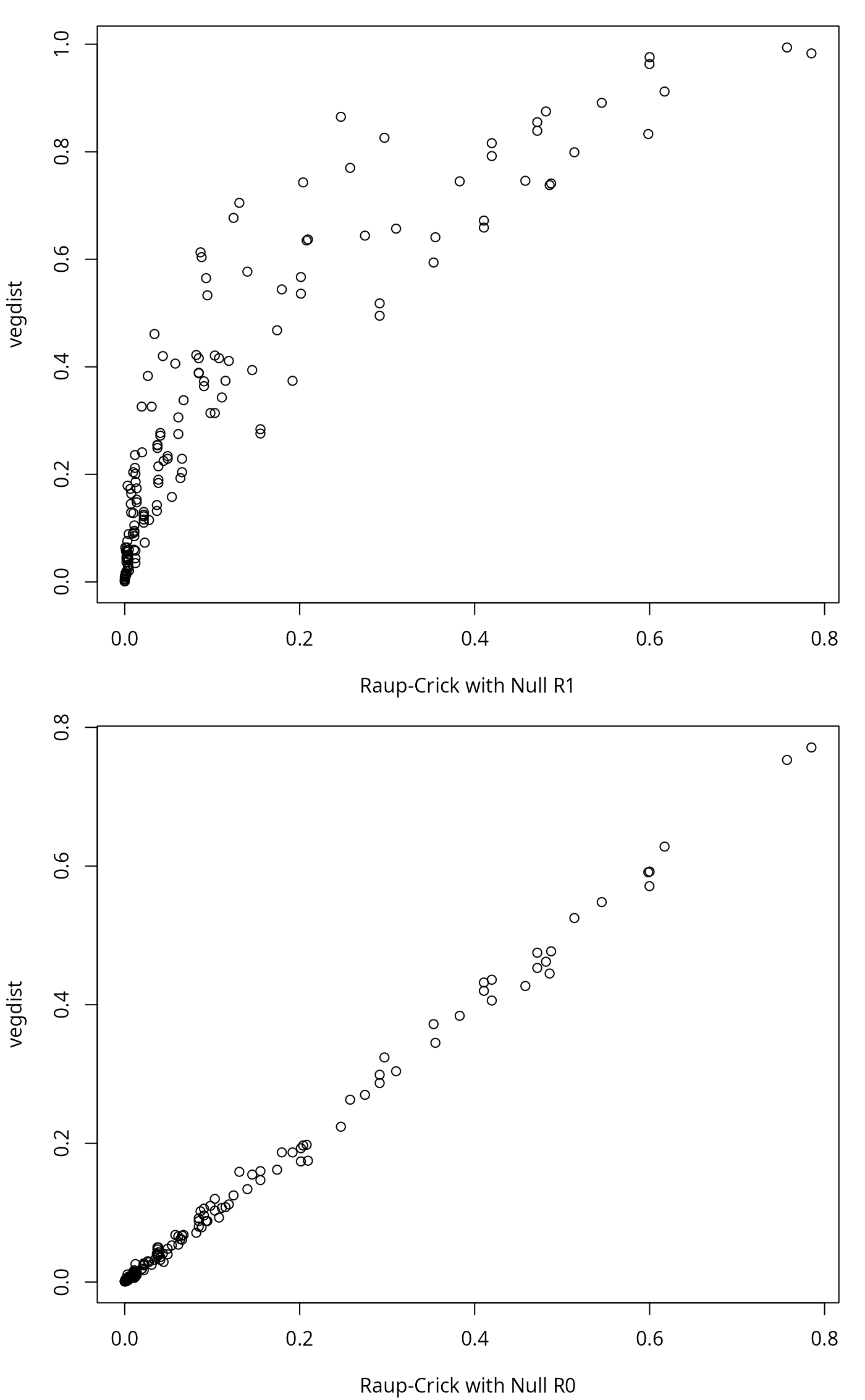 plot(dr1 ~ d, xlab = "Raup-Crick with Null R1", ylab="vegdist")