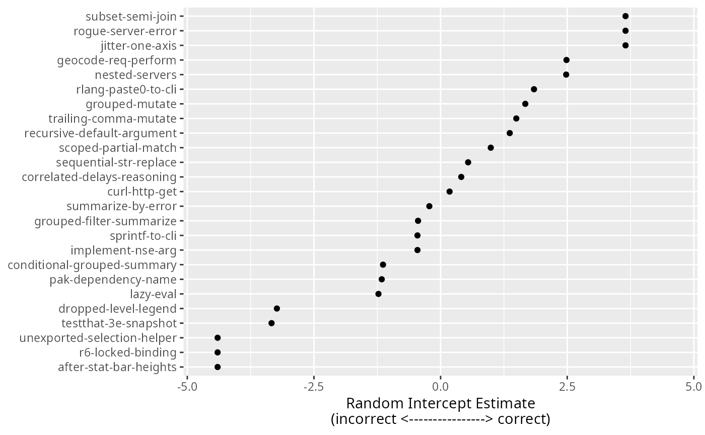 labs(y = NULL, x = "Random Intercept Estimate\n(incorrect <----------------> correct)") +